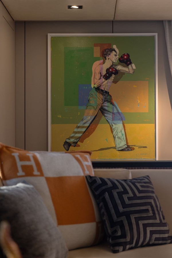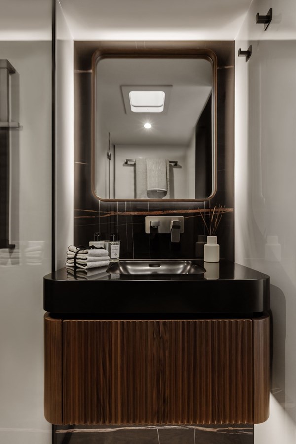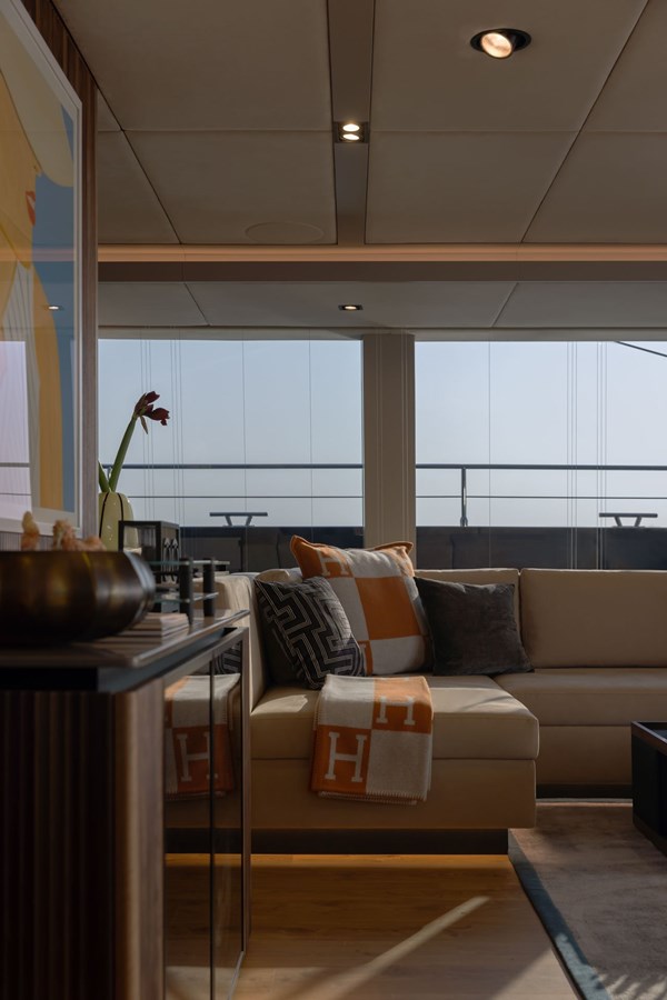 AHAVA, the Sunreef 80 sailing catamaran, is a masterpiece of luxury and design, offering an extraordinary charter experience defined by elegance, comfort, and sophistication. The yacht’s beautifully curated interiors feature fine walnut wood paneling, plush designer furnishings, and a collection of exceptional art pieces by renowned artists such as Alex Katz, Julian Opie, and Christopher Kieling. These remarkable pieces perfectly complement the yacht’s sophisticated, contemporary design, transforming every space into a floating gallery.The expansive main saloon is designed for both entertainment and relaxation, with a refined dining area, a state-of-the-art barista station, and an inviting lounge with panoramic views. The master suite is a serene retreat, boasting a king-sized bed, a spa-inspired en-suite bathroom, and a private Hammam for ultimate rejuvenation.Outdoor living is equally impressive, with a spacious flybridge featuring a hammock chair, custom dining tables, and a bar—ideal for sunset cocktails. The aft deck offers elegant seating and ample space for alfresco dining and social gatherings. Guests can enjoy both indoor and outdoor cinema setups, with the option of watching films in the luxurious comfort of the main saloon or under the stars on the aft deck. Whether indulging in watersports, exploring on e-bikes, or enjoying an open-air movie night, AHAVA delivers an unparalleled luxury charter experience.