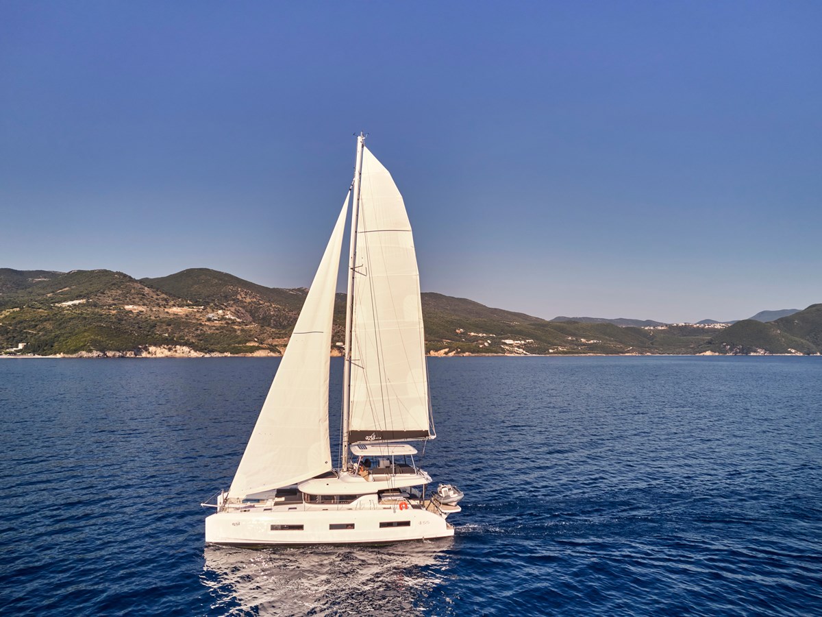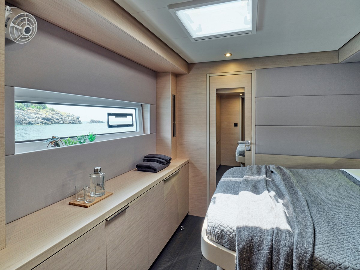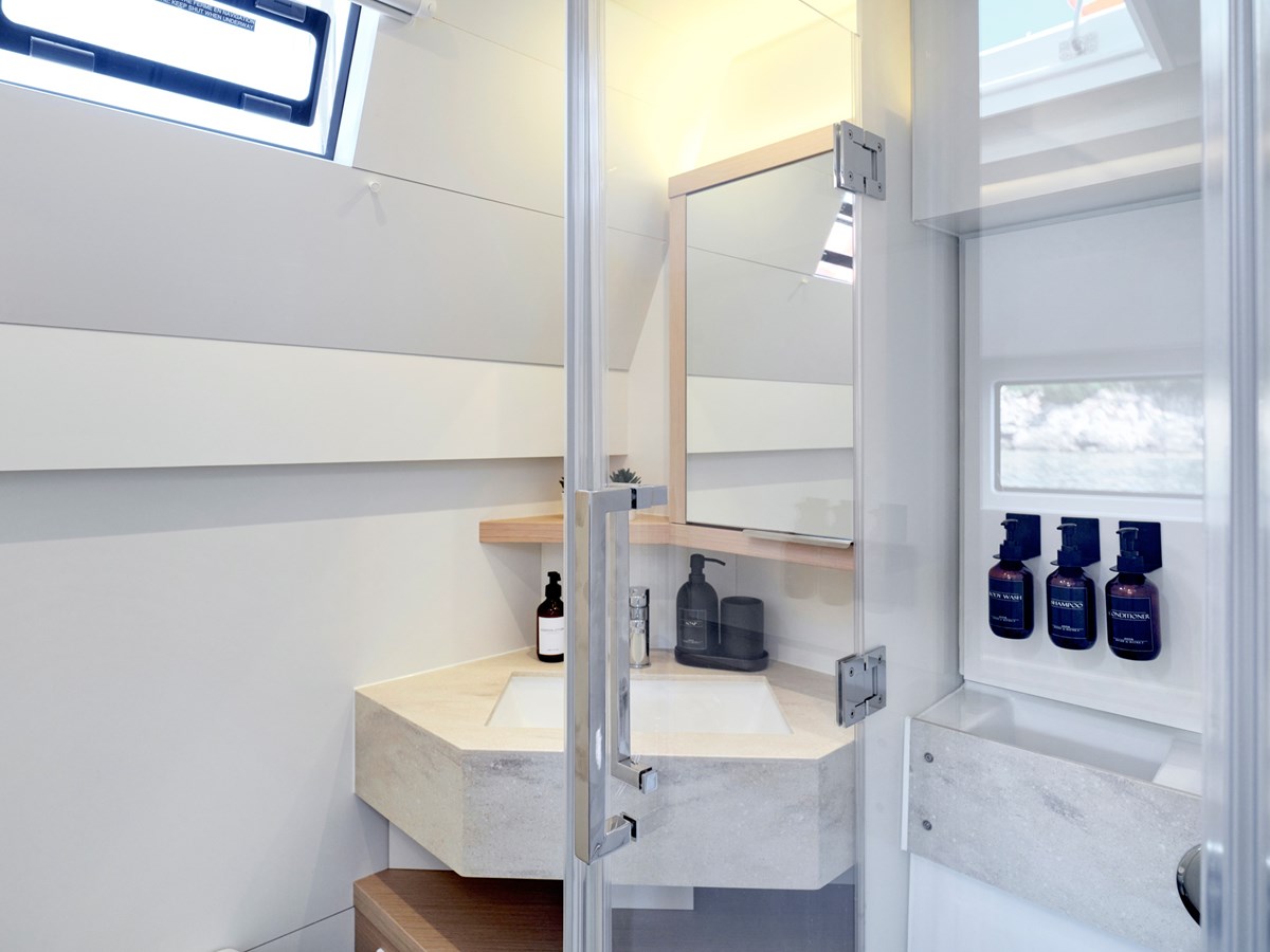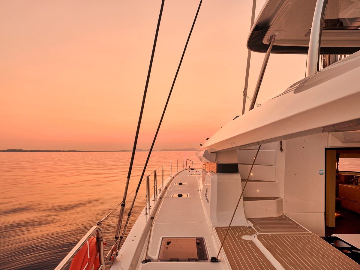 Our new Lagoon 55, Azul, is characterized by an impressive sense of spaces maximizing comfort while maintaining great performance under sail. The new on-board access and circulation concepts offer a brand-new sensation. The transoms are no longer just a circulation area but a real living space at anchor, for cooking in the outdoors or simply for dreaming with your feet in the water. Her high-end interior touches and her natural sunlight in her saloon and rooms are meant to evoke feelings of peace and harmony.