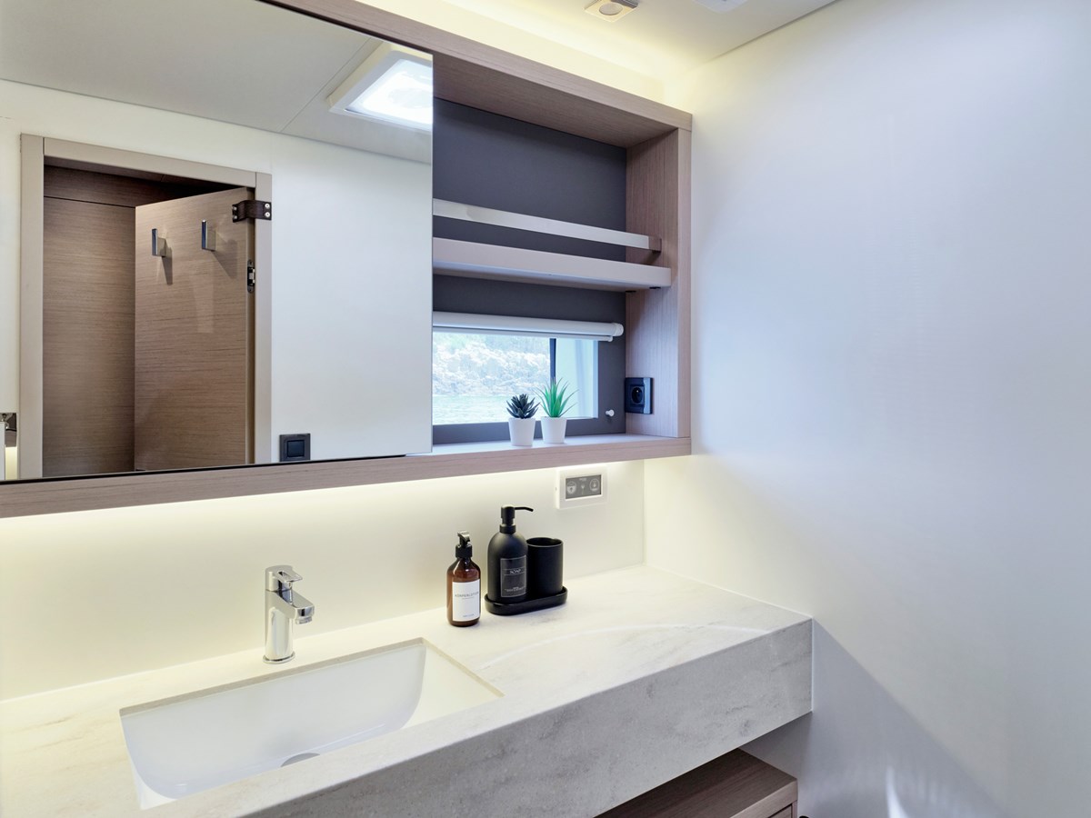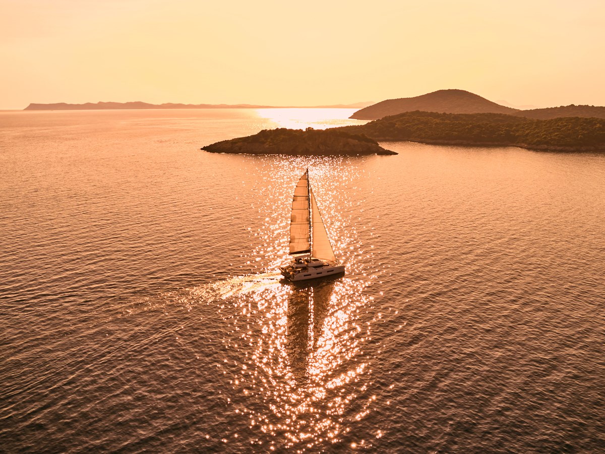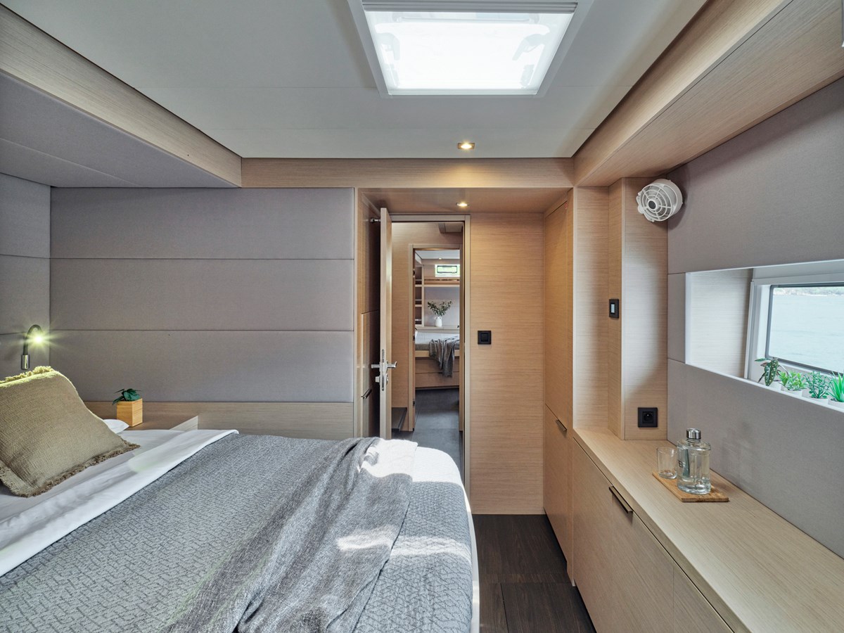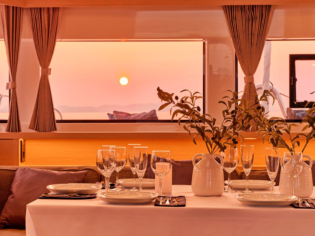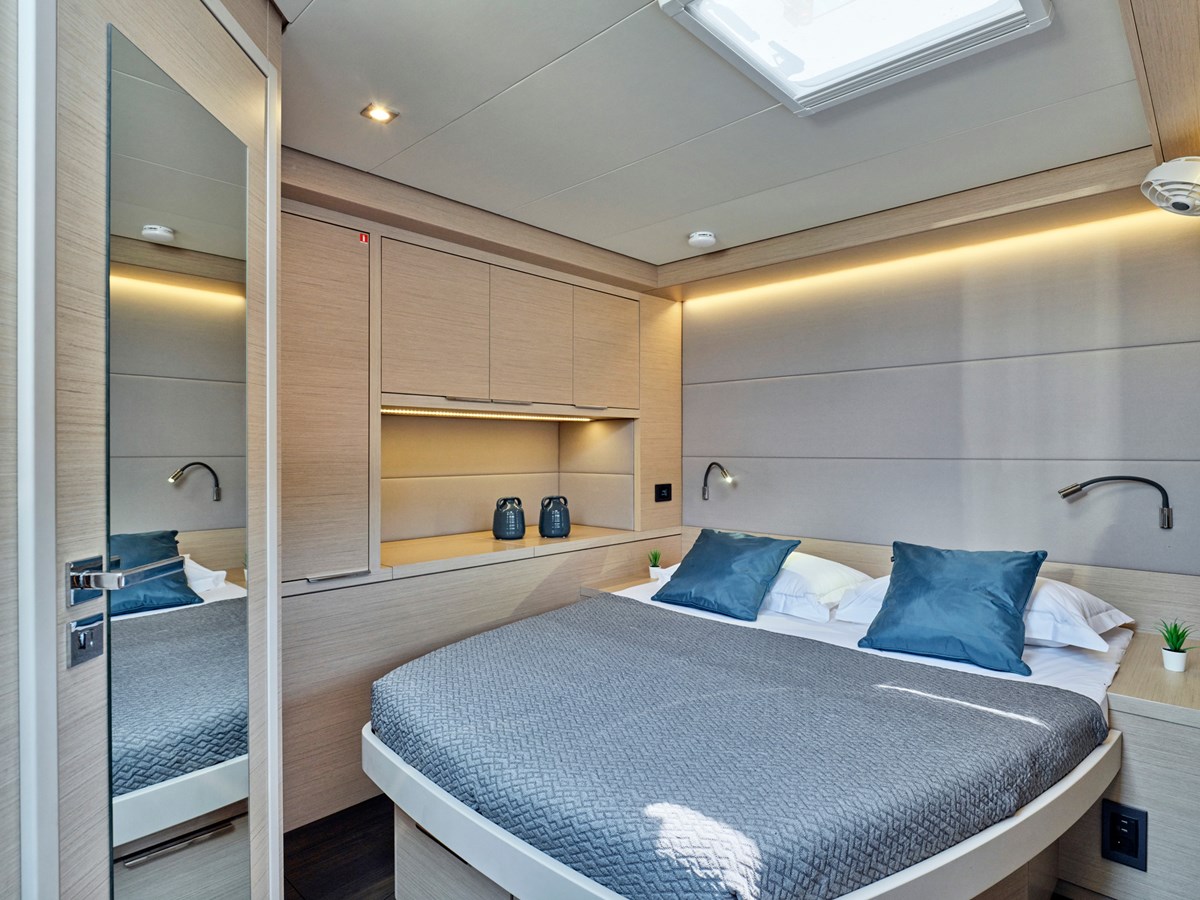 Our new Lagoon 55, Azul, is characterized by an impressive sense of spaces maximizing comfort while maintaining great performance under sail. The new on-board access and circulation concepts offer a brand-new sensation. The transoms are no longer just a circulation area but a real living space at anchor, for cooking in the outdoors or simply for dreaming with your feet in the water. Her high-end interior touches and her natural sunlight in her saloon and rooms are meant to evoke feelings of peace and harmony.