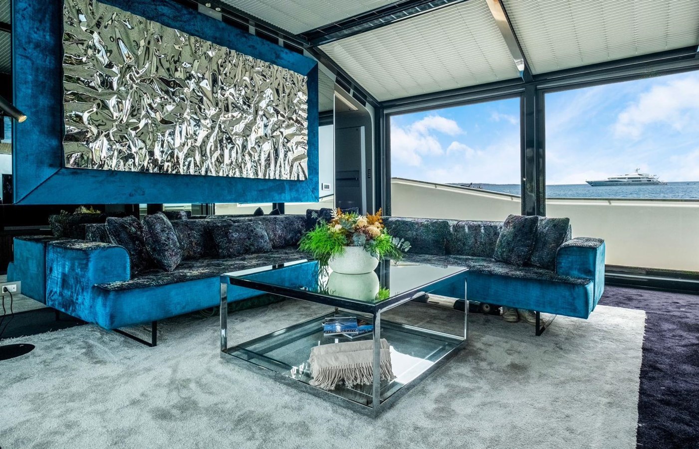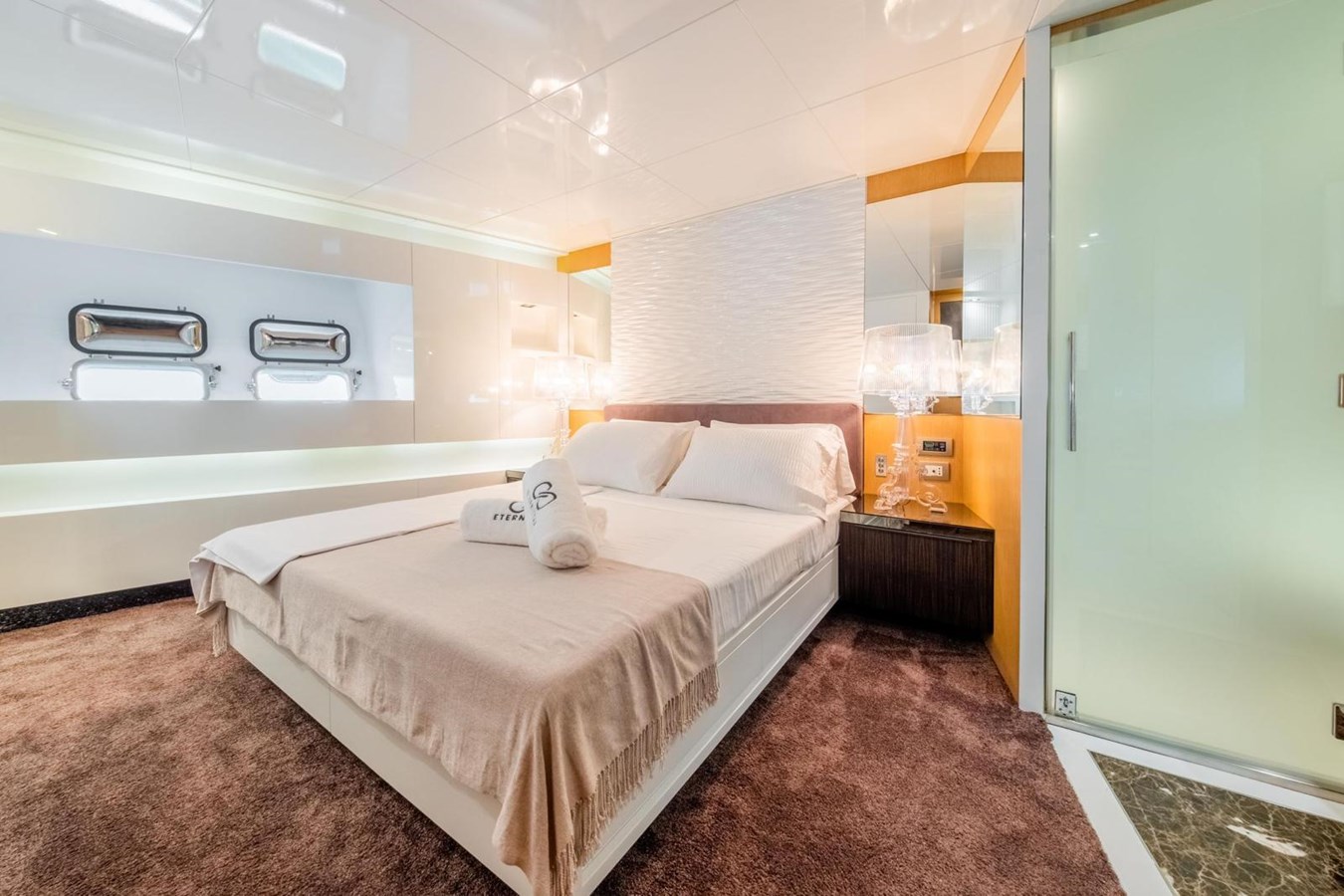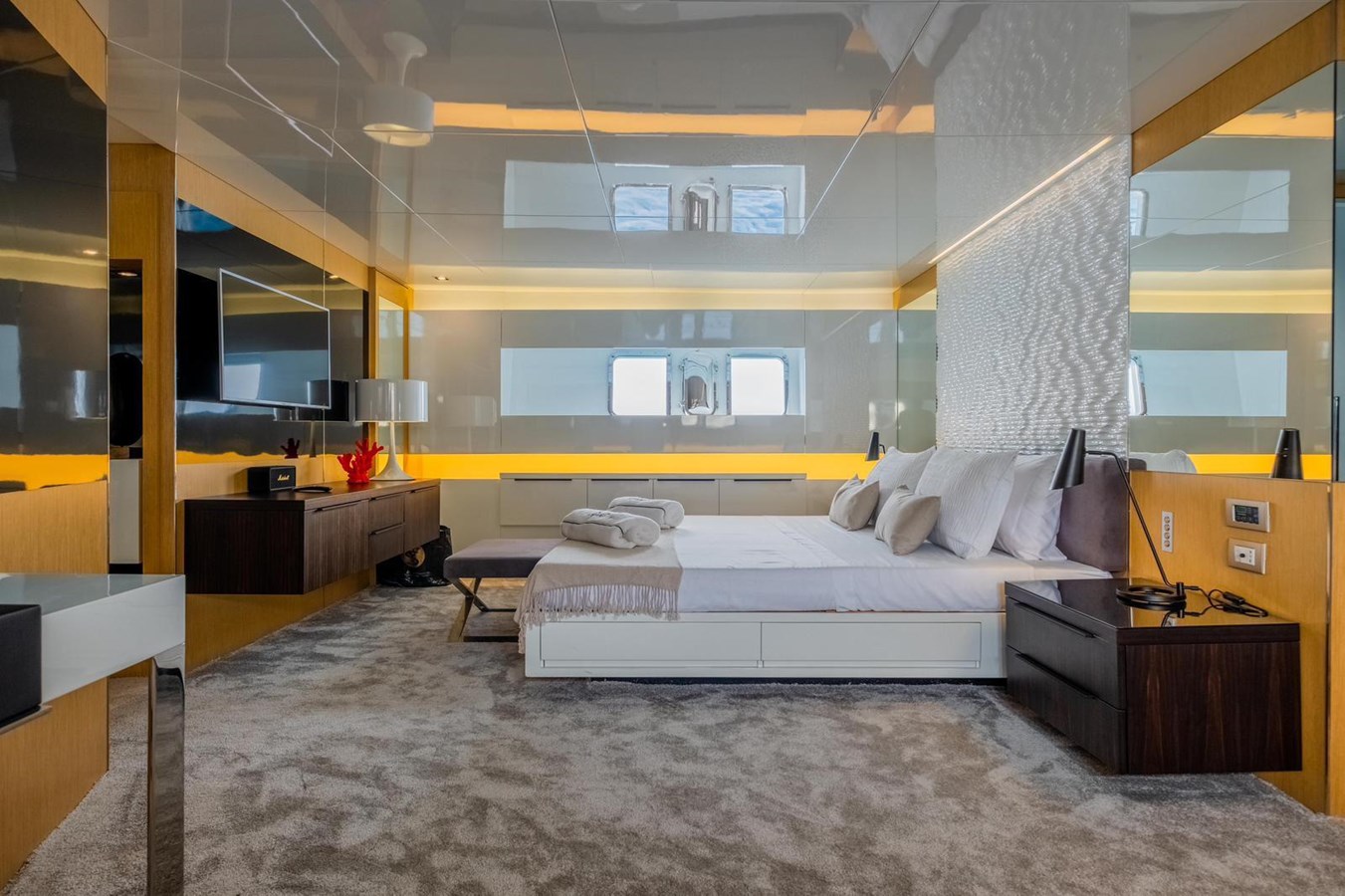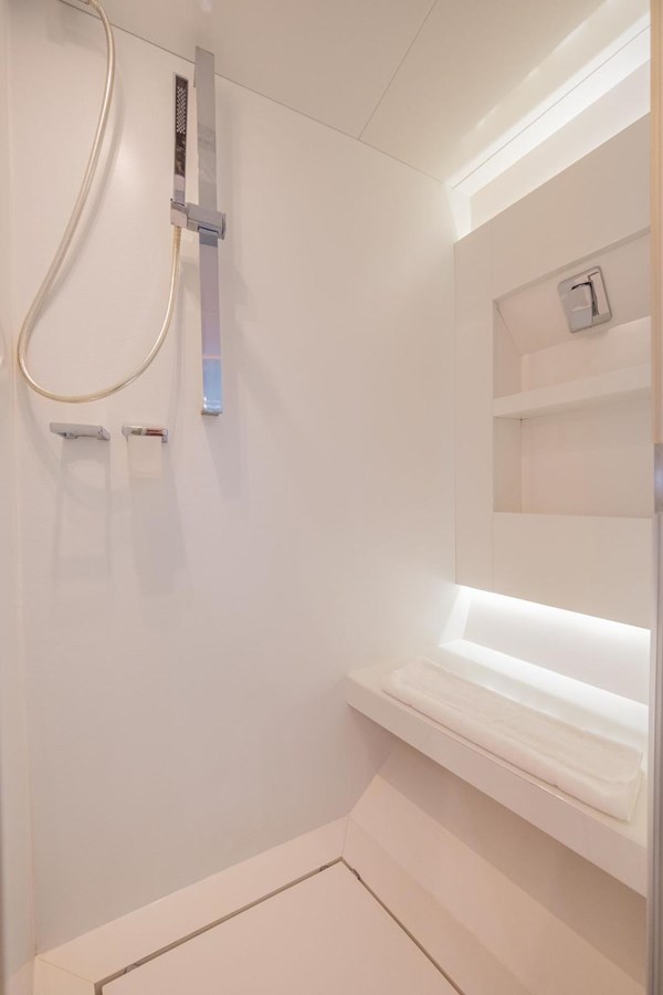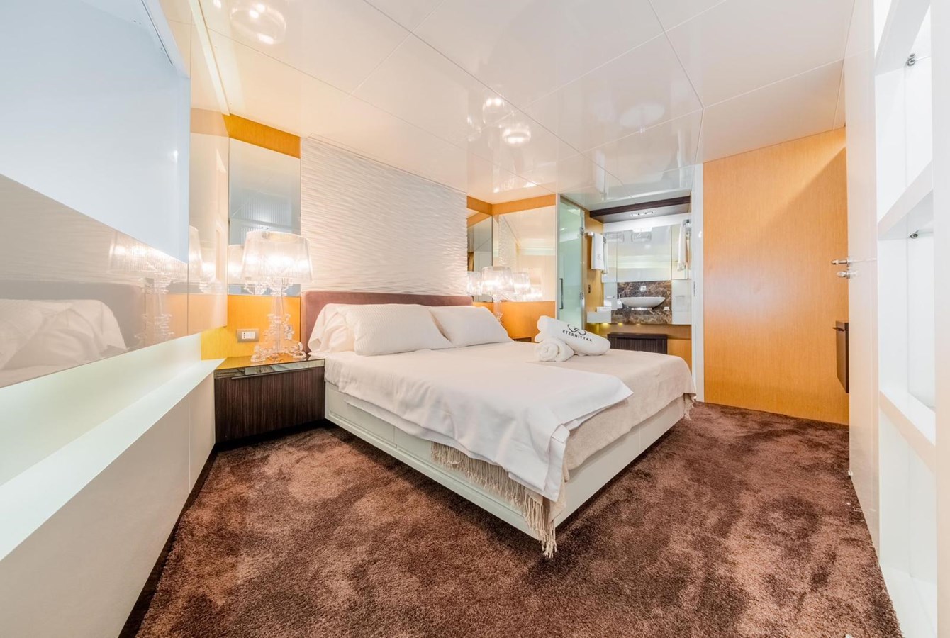 The interior flows elegantly to the exterior thanks to plenty of windows and natural light. The main saloon offers a plush seating area, coffee table and entertainment systems, while contemporary décor and well-appointed lighting create an elegant yet relaxed atmosphere. Set in an open plan format, the formal dining table is forward of the lounge area, with seating for all eight guests.