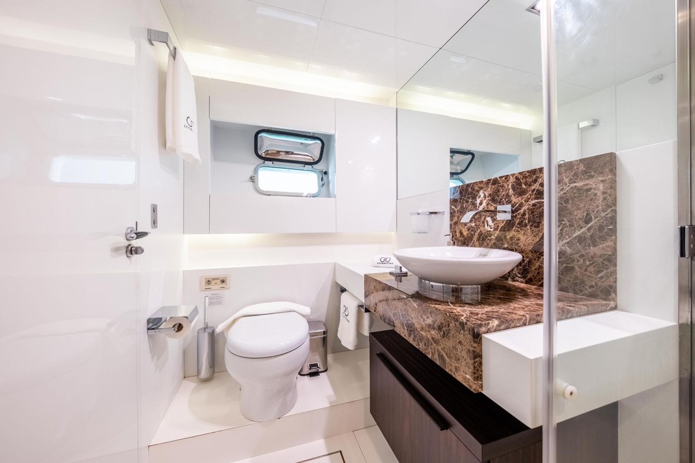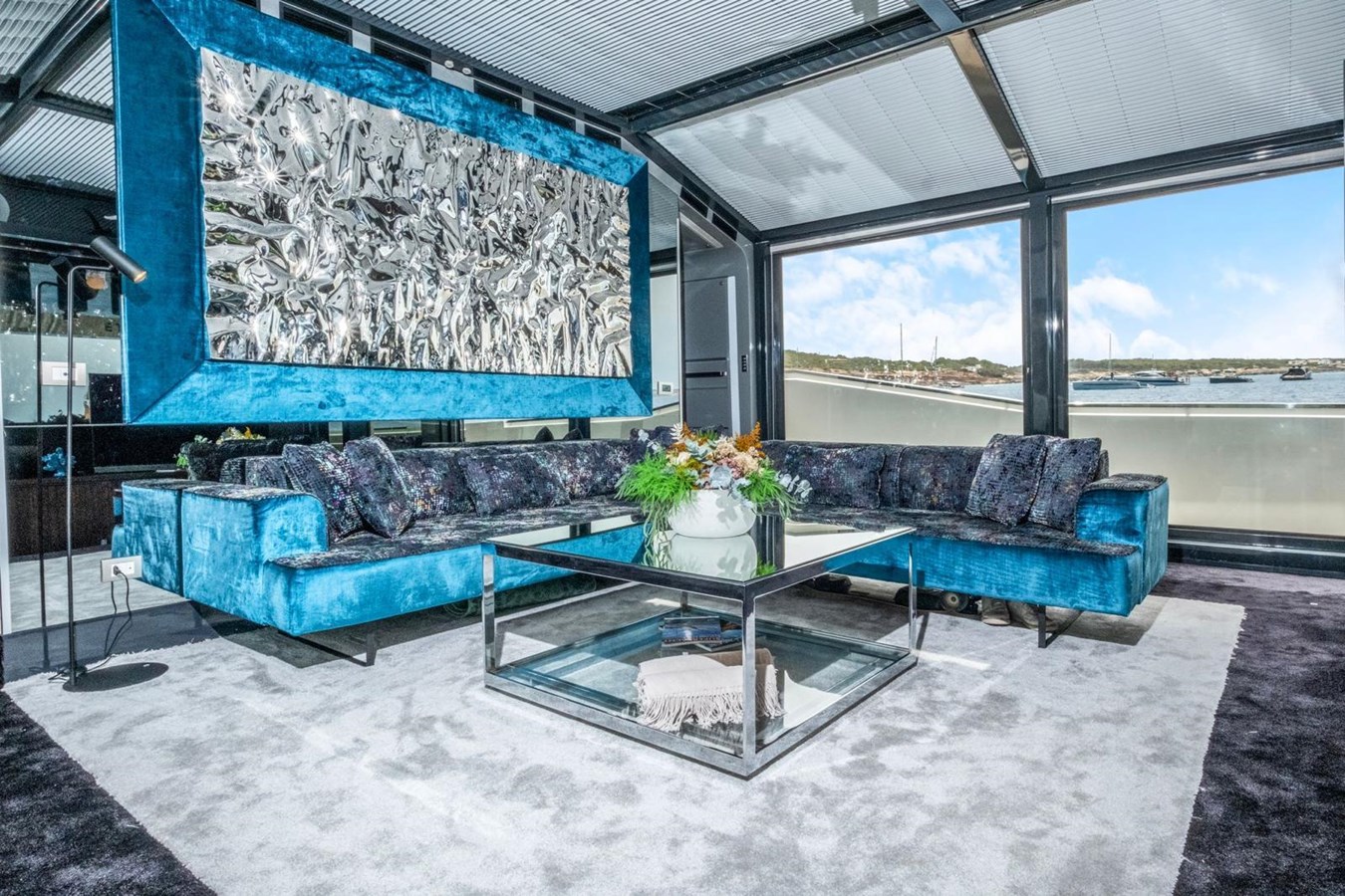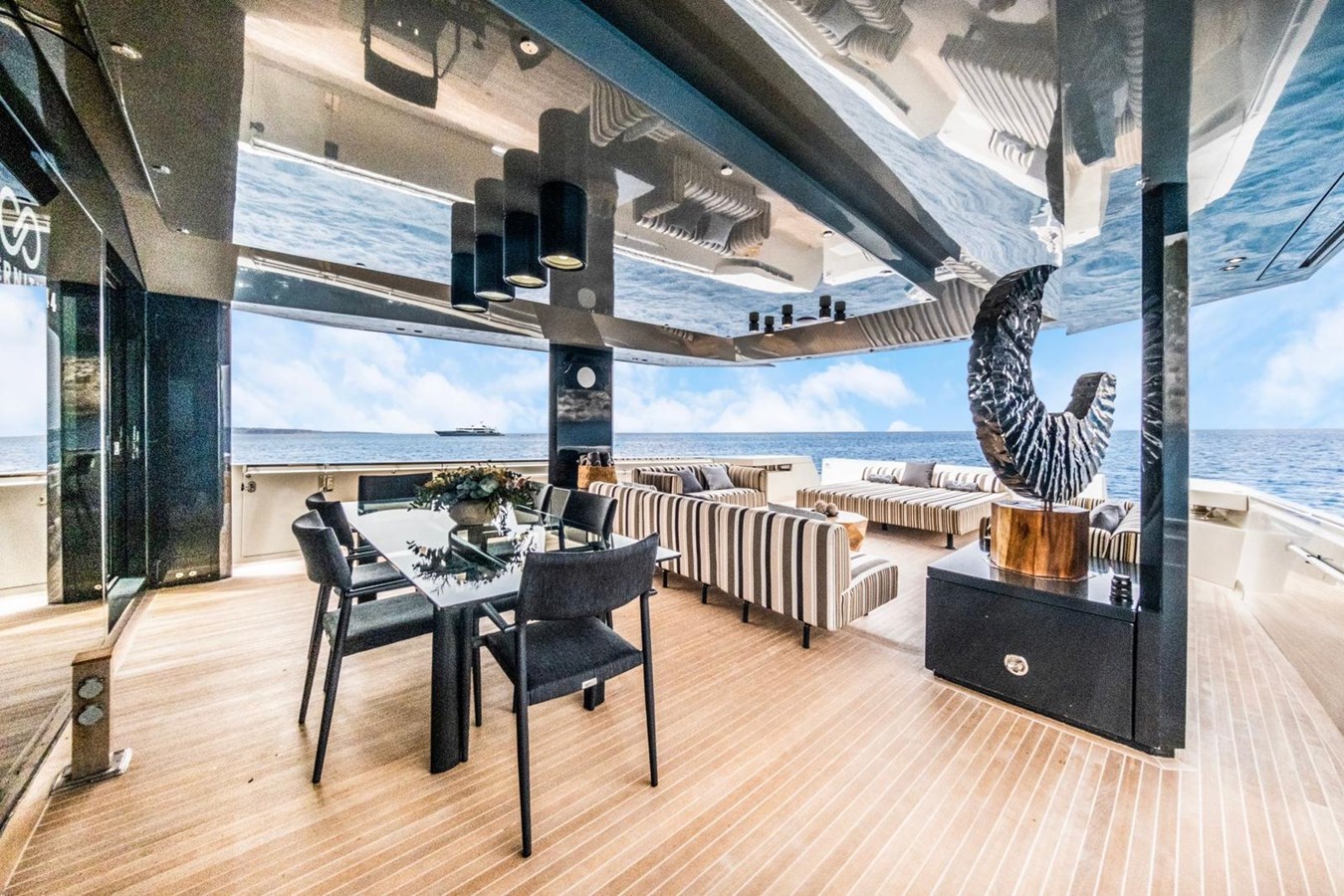 The interior flows elegantly to the exterior thanks to plenty of windows and natural light. The main saloon offers a plush seating area, coffee table and entertainment systems, while contemporary décor and well-appointed lighting create an elegant yet relaxed atmosphere. Set in an open plan format, the formal dining table is forward of the lounge area, with seating for all eight guests.