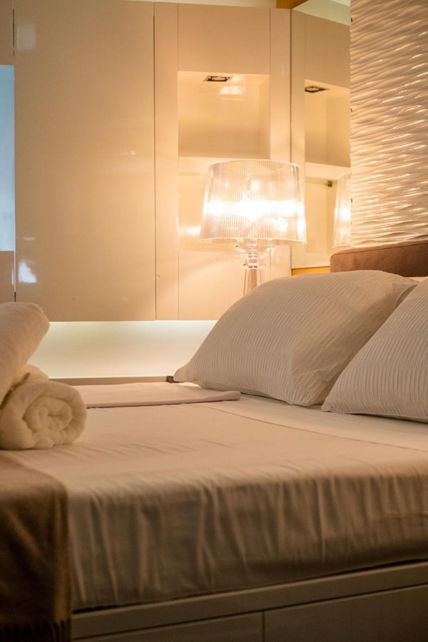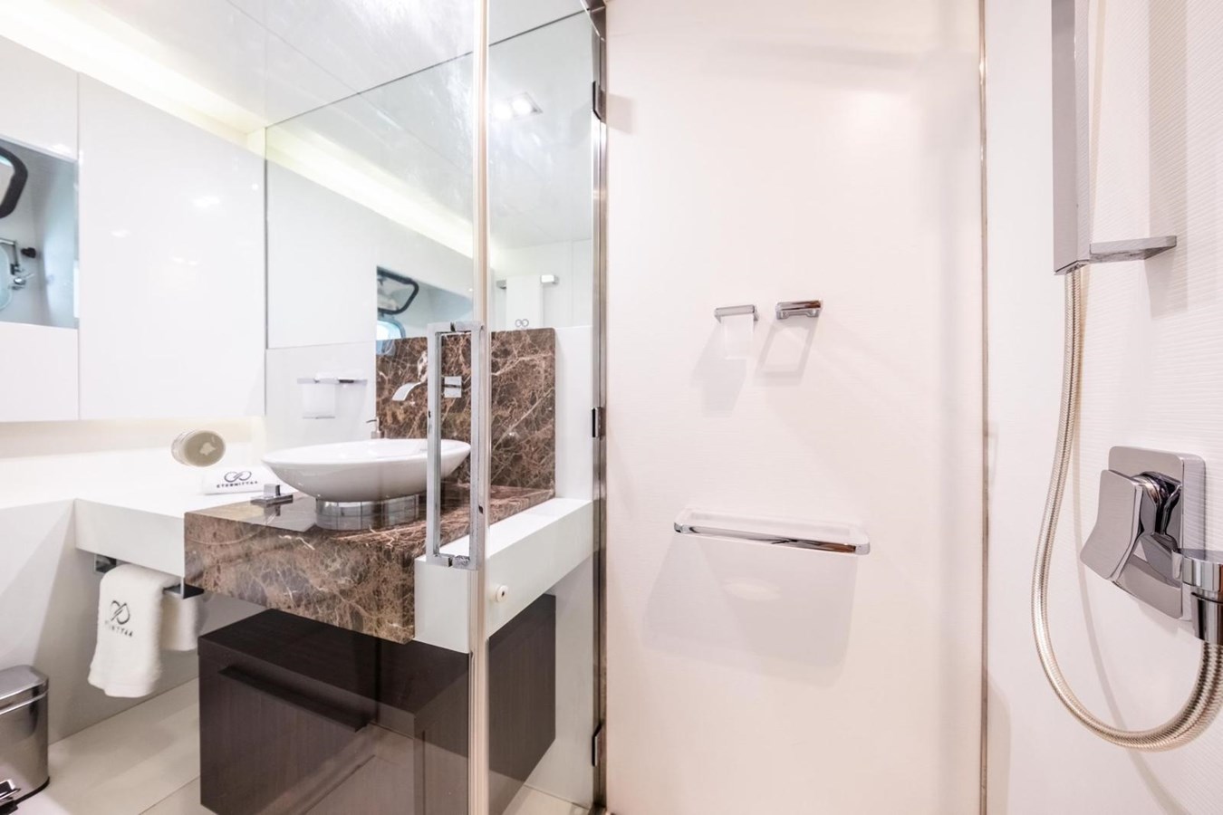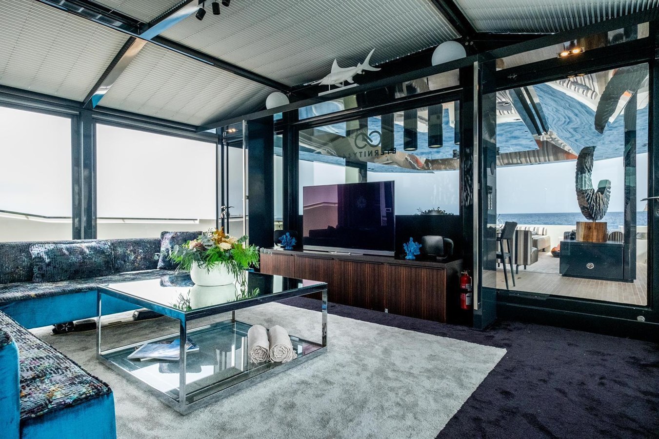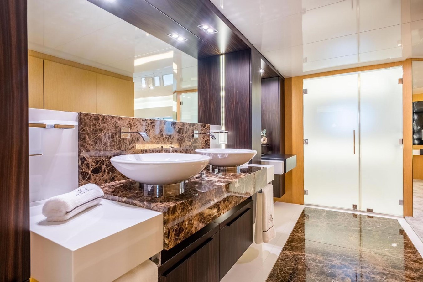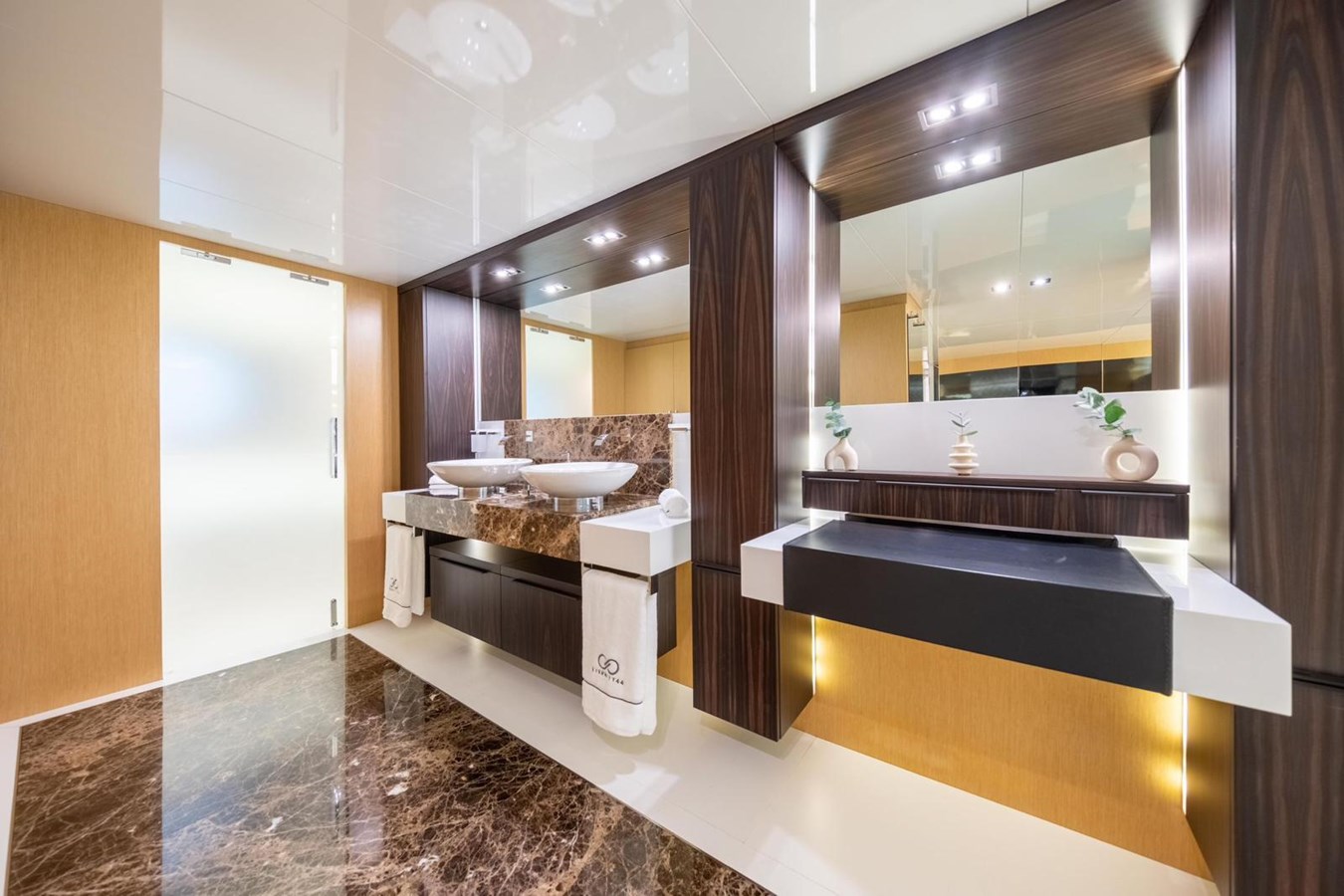 The interior flows elegantly to the exterior thanks to plenty of windows and natural light. The main saloon offers a plush seating area, coffee table and entertainment systems, while contemporary décor and well-appointed lighting create an elegant yet relaxed atmosphere. Set in an open plan format, the formal dining table is forward of the lounge area, with seating for all eight guests.