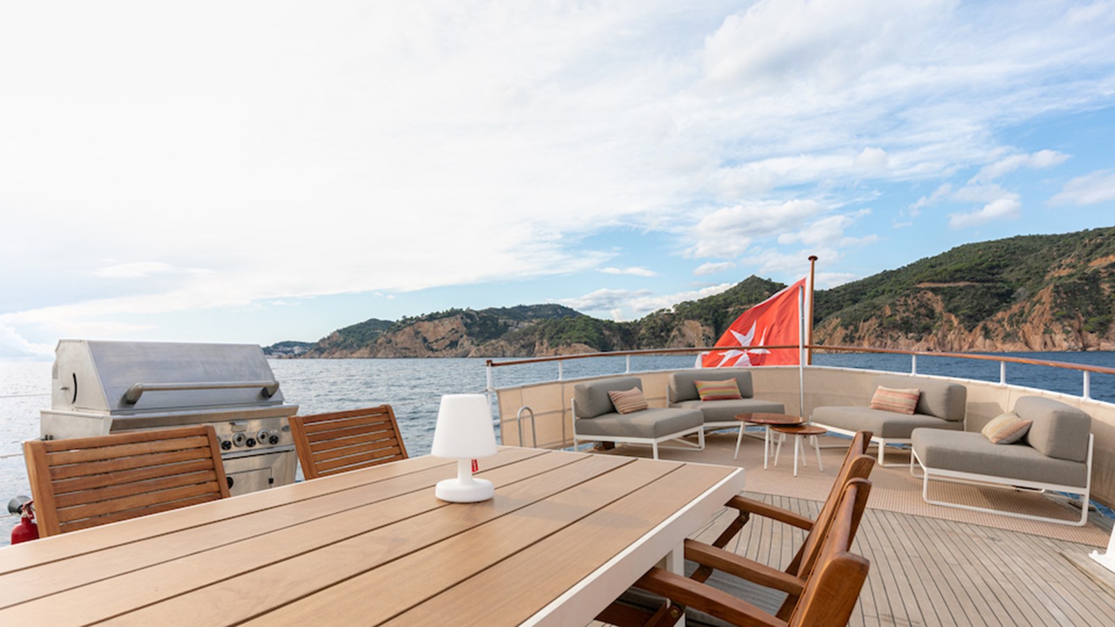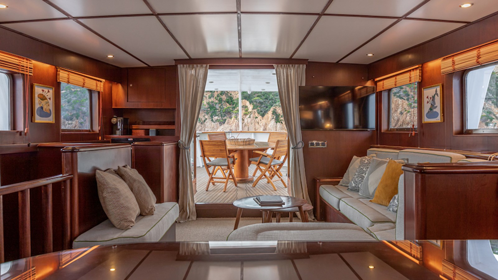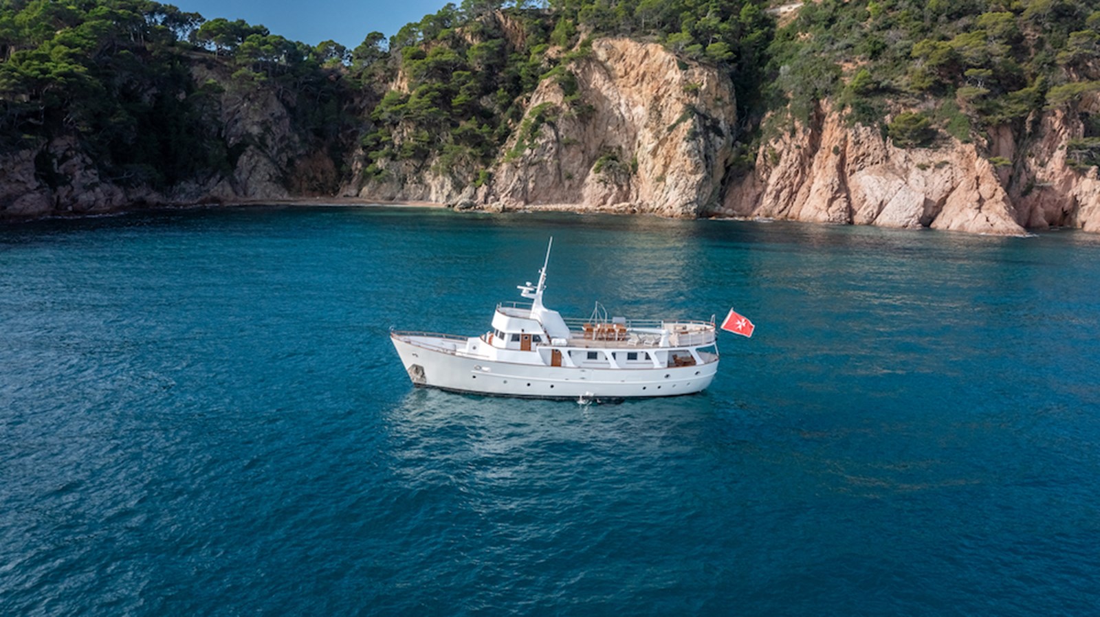 Built in the famous Berwick shipyard in 1962, Fairmile is a vintage motor yacht that has been lovingly restored to her former glory. Hosting up to six people, accommodation is comprised of three charming cabins, all with full en-suite facilities.The living area boasts a beautiful wooden bar, an elegant six-seated mahogany dining table, and a luxurious sofa area.Up on top, the decks are laid out for ultimate relaxation; sun loungers, sofas, a large barbecue, and dining tables on both the upper and main deck.