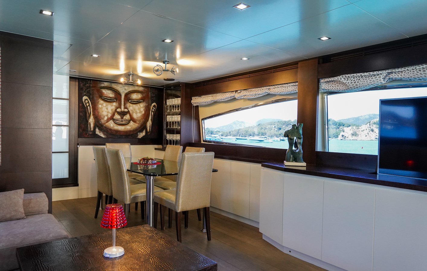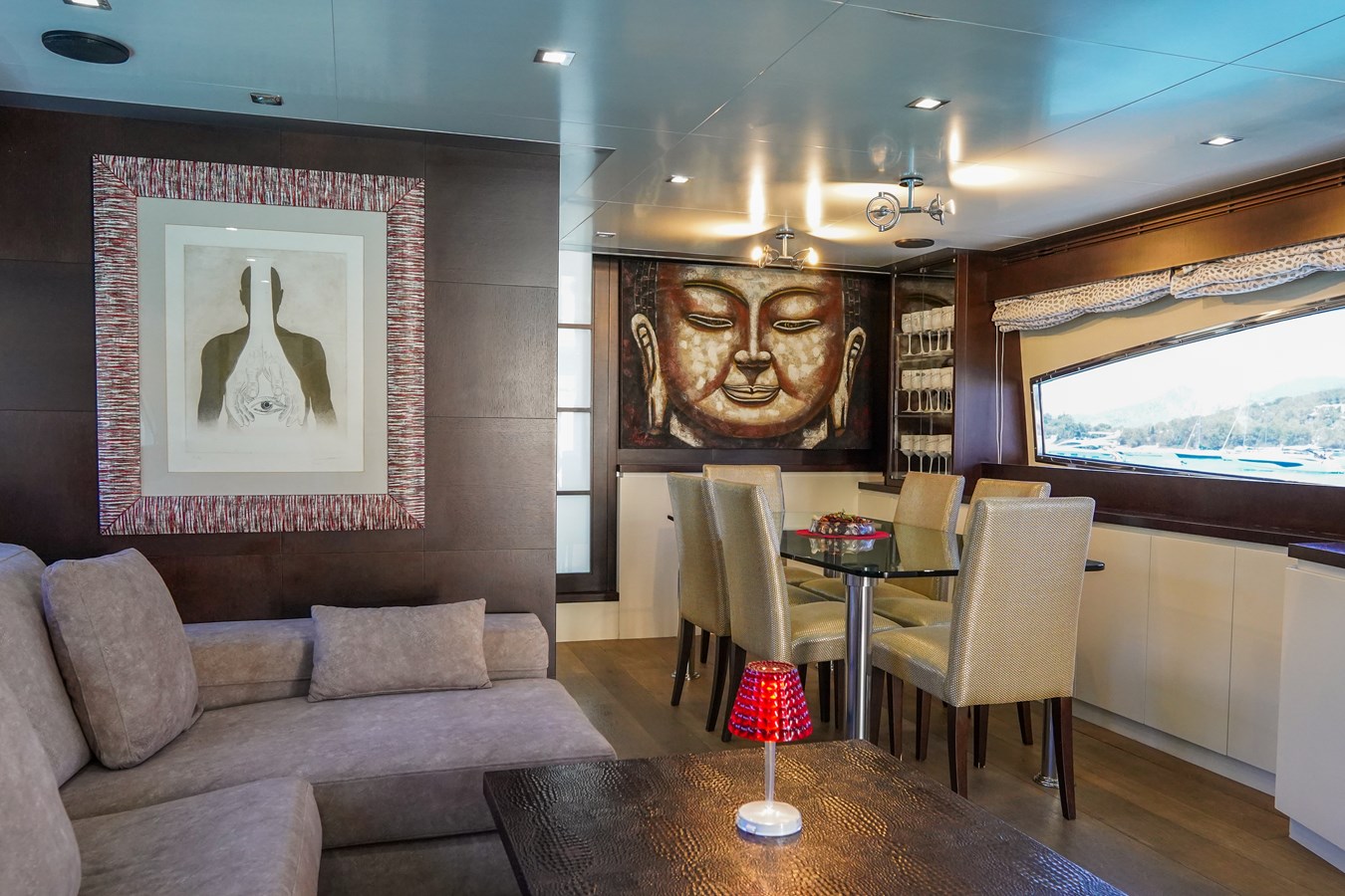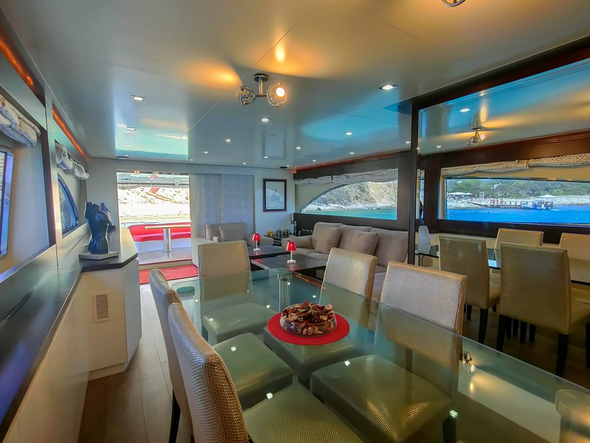 First of all this Astondoa 82 - M/Y GEMINIS has an elegant contemporary interior. This is due to featuring light panels balanced harmoniously with rich espresso toned woods. The living and dining room are open plan surrounded by large panoramic windows. The lounge is aft and boasts 2 plush sofas. In addition, to starboard is a full entertainment system. Finally, forward of the lounge, a formal dining area seats guests in style. Accommodation aboard the Motor Yacht GEMINIS is below deck in three double and two twin cabins (Convertible the twin beds in one double).