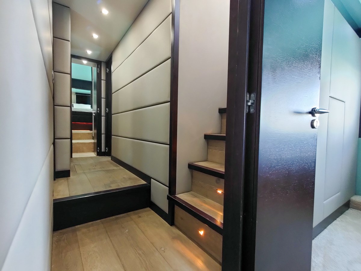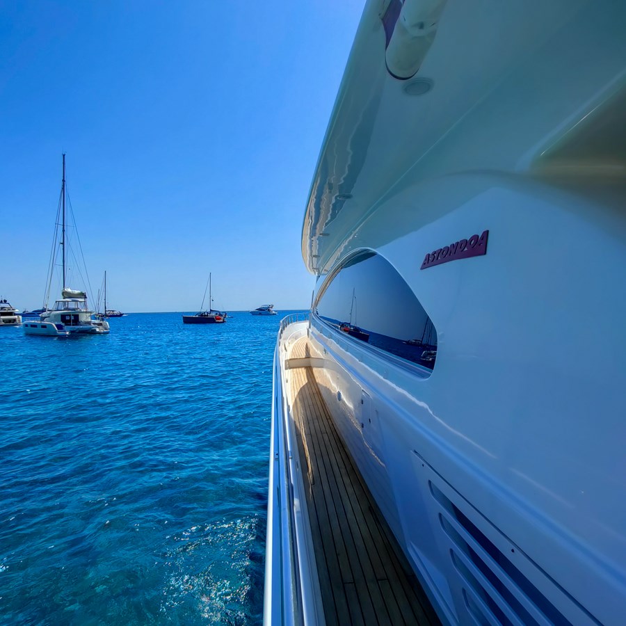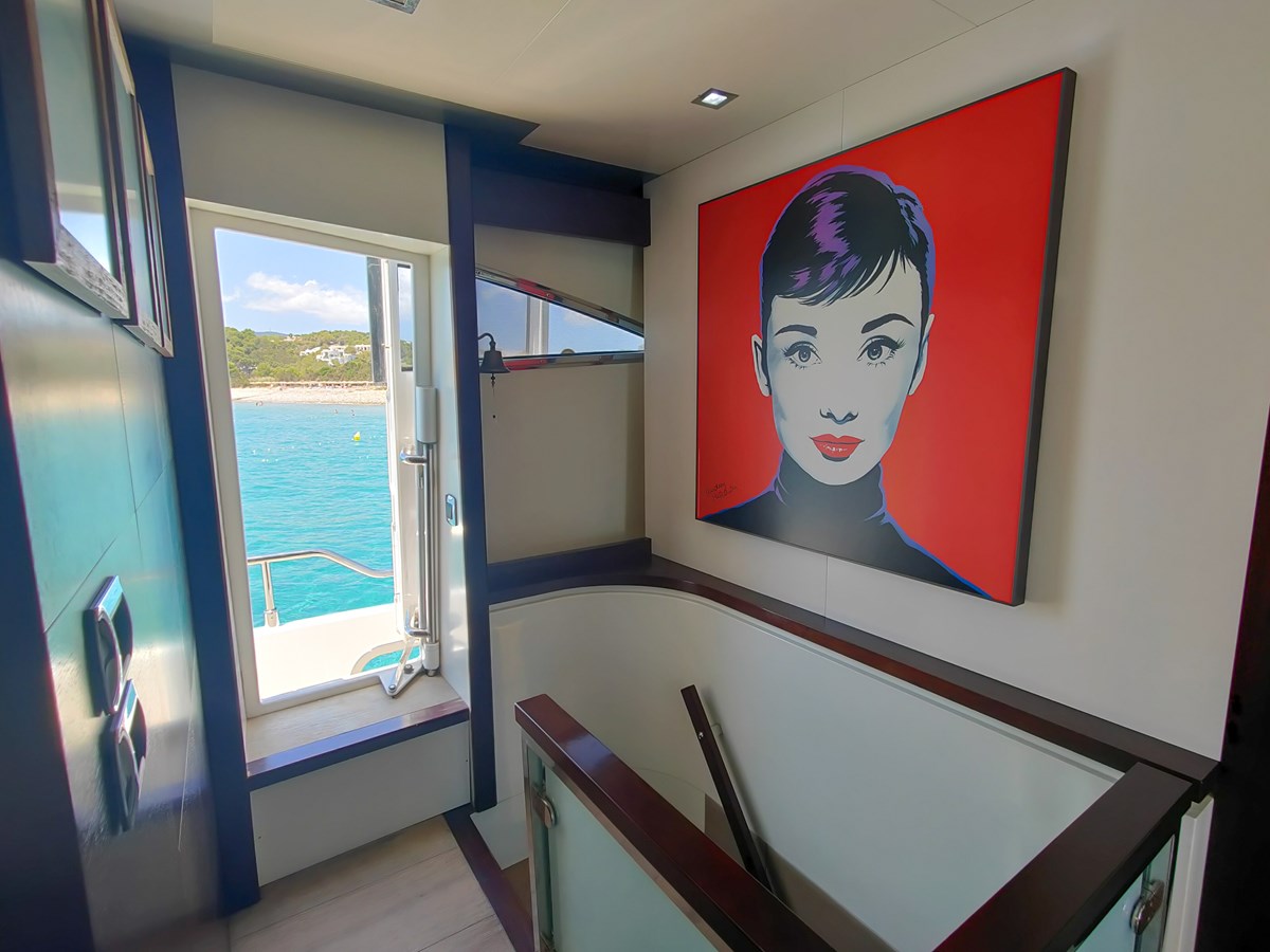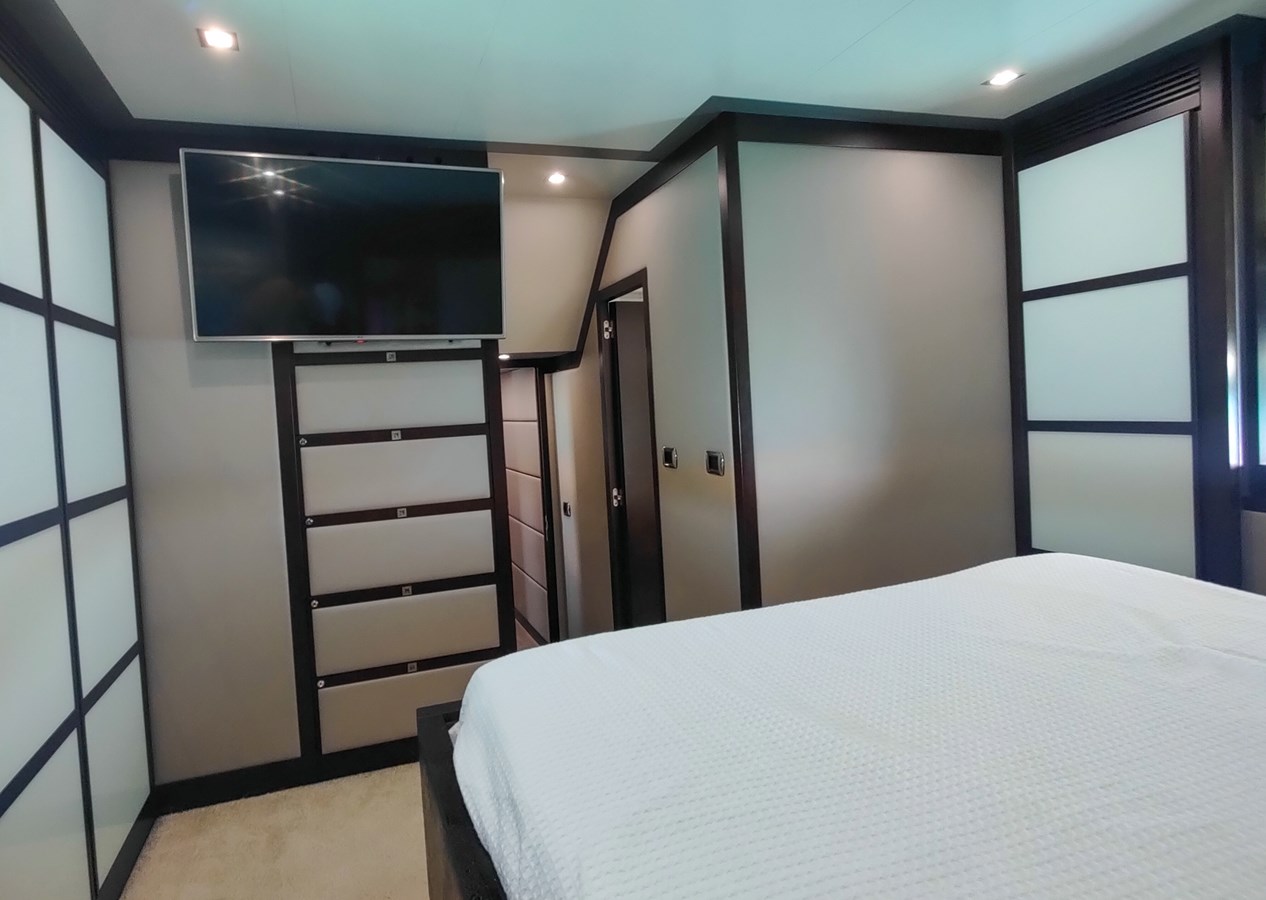 First of all this Astondoa 82 - M/Y GEMINIS has an elegant contemporary interior. This is due to featuring light panels balanced harmoniously with rich espresso toned woods. The living and dining room are open plan surrounded by large panoramic windows. The lounge is aft and boasts 2 plush sofas. In addition, to starboard is a full entertainment system. Finally, forward of the lounge, a formal dining area seats guests in style. Accommodation aboard the Motor Yacht GEMINIS is below deck in three double and two twin cabins (Convertible the twin beds in one double).