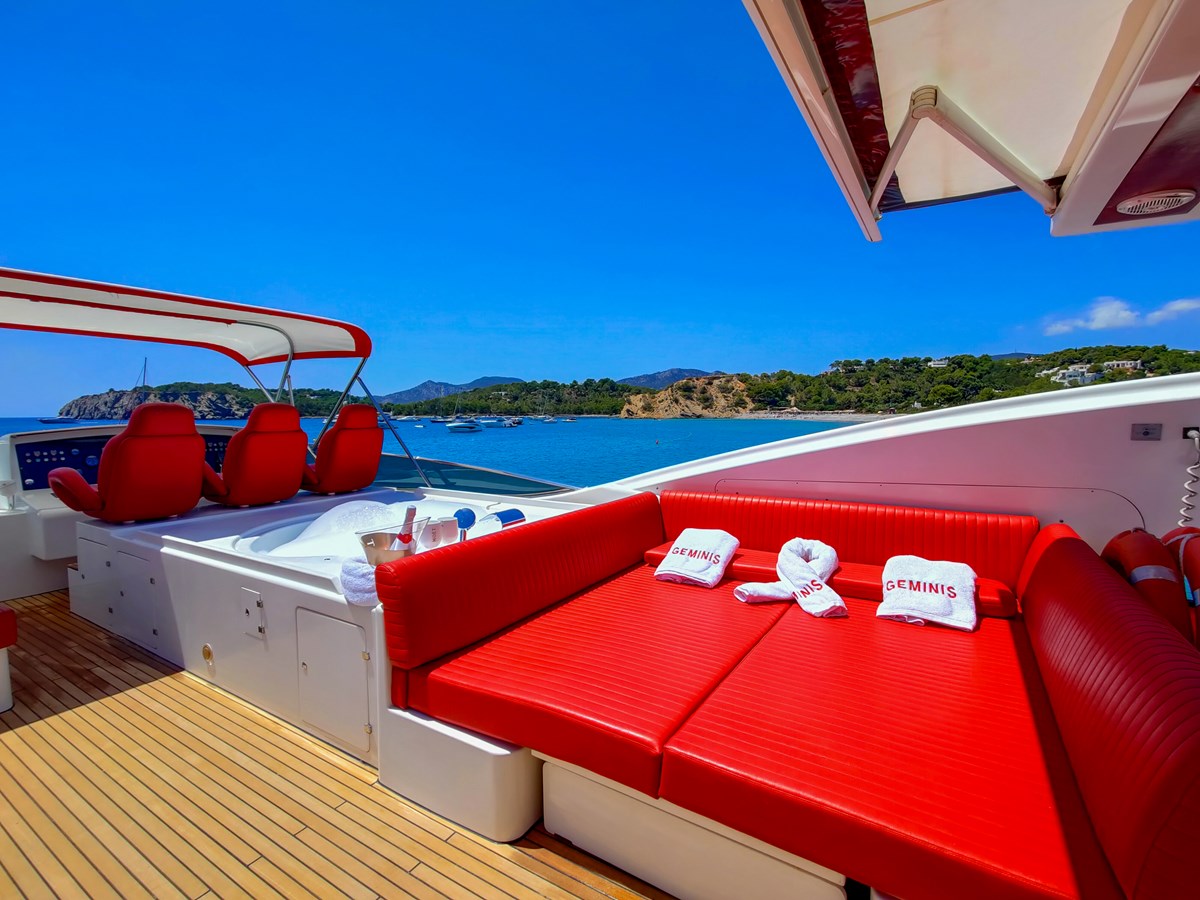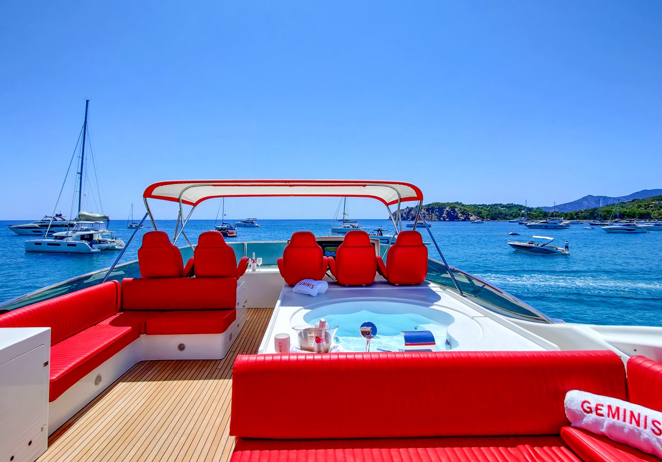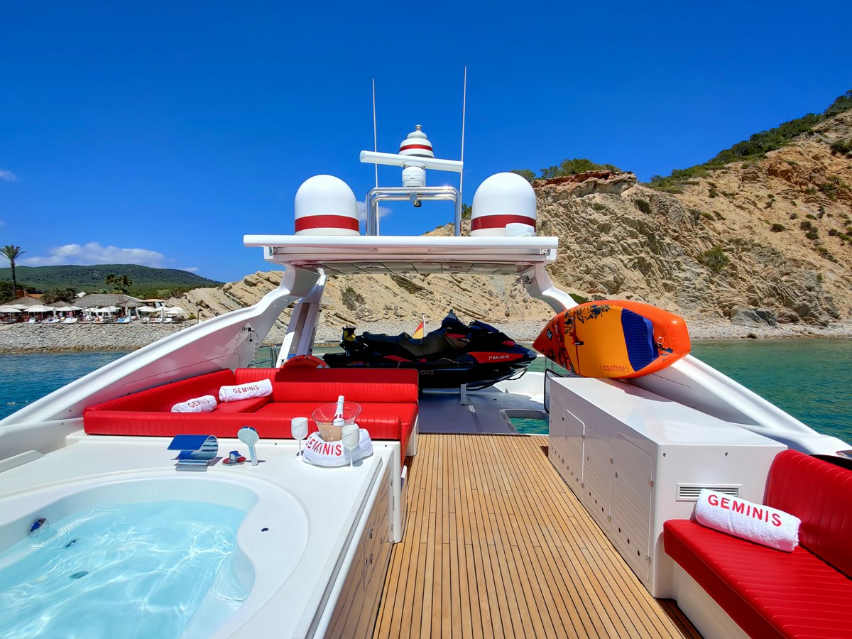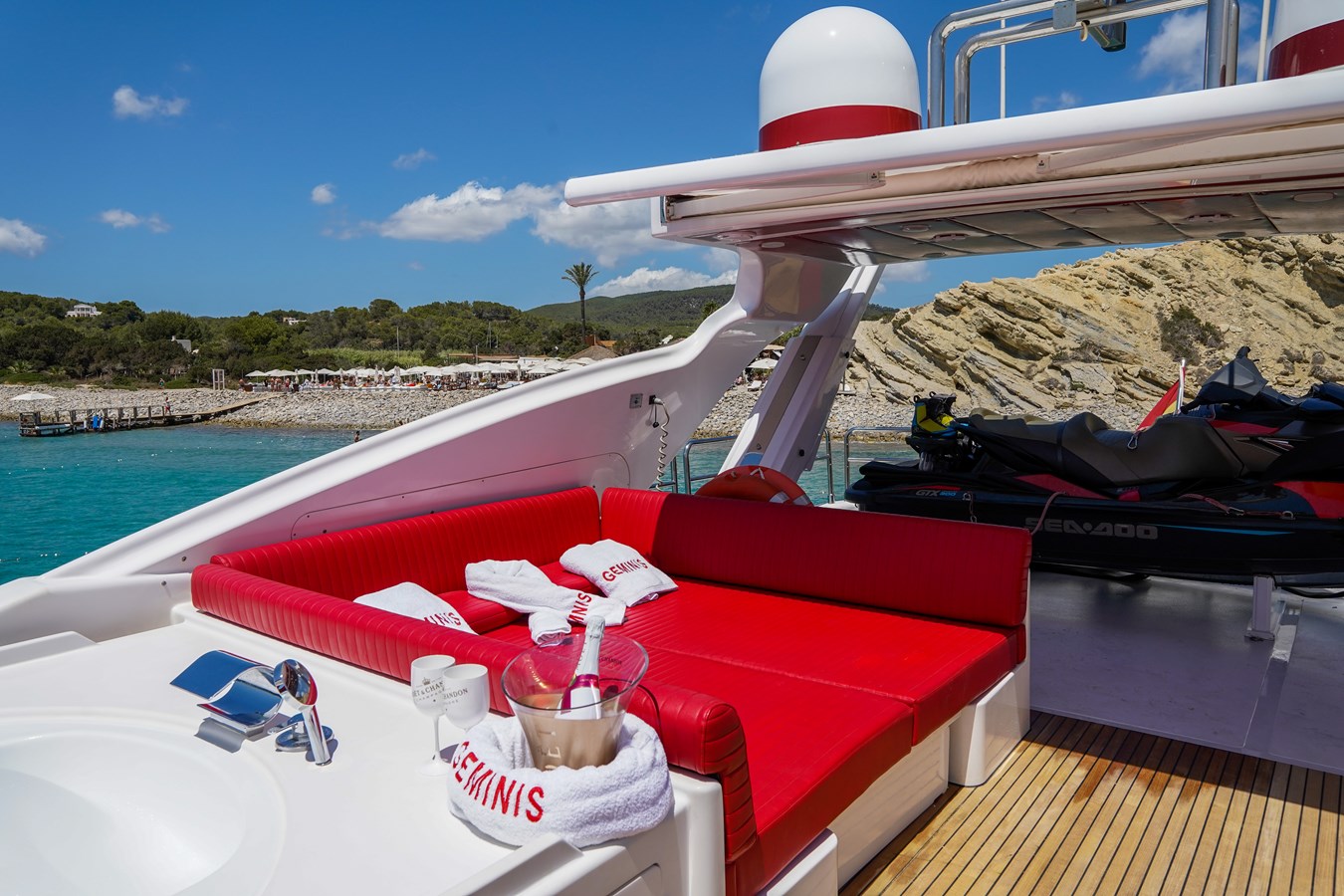GEMINIS has plenty of exterior decks space to enjoy the warm Mediterranean climates. The aft deck is shaded and boasts an alfresco dining option and built in upholstered seating. Water enthusiasts will be able to make effortless use of the great selection of water toys (Jet Ski, SEABOB, Inflatables) from the extended swim platform. Charter yacht GEMINI is a sun worshipers paradise offering ample sunning. The foredeck has a double sunpad which is easily accessed from the wide side decks. Above, the flybridge offers plenty of further sunning on 2 sunpads, seating and deck space. Probably most importantly for many there is also a flybridge jacuzzi on the deck.