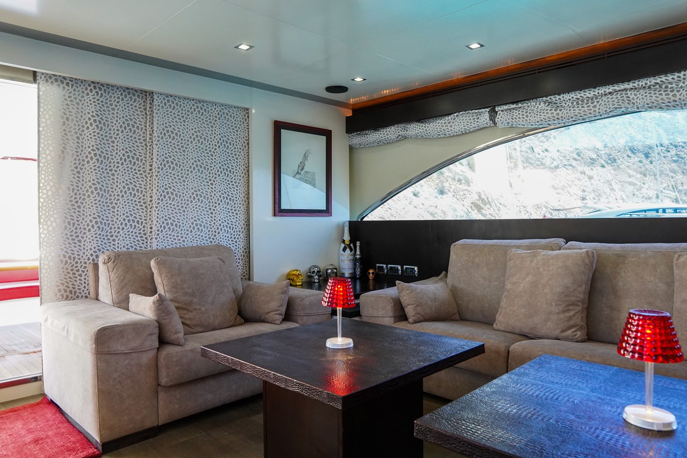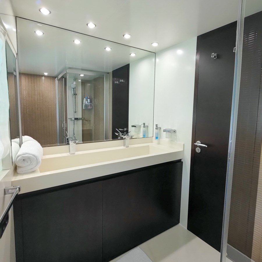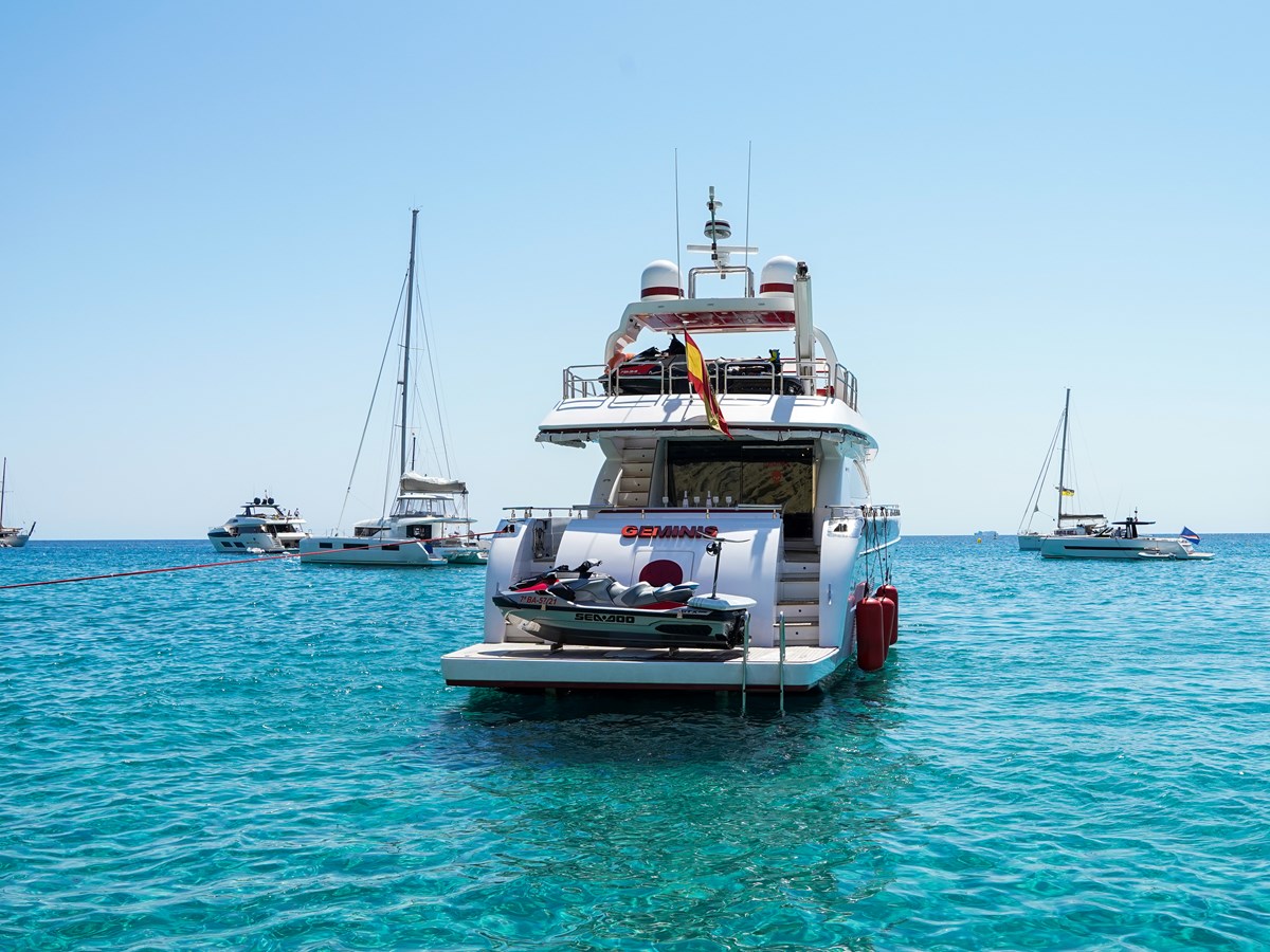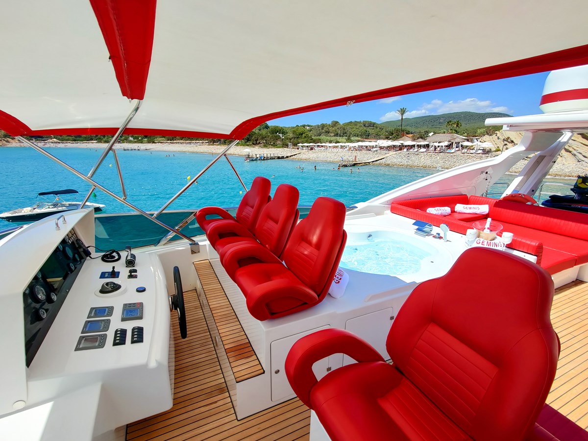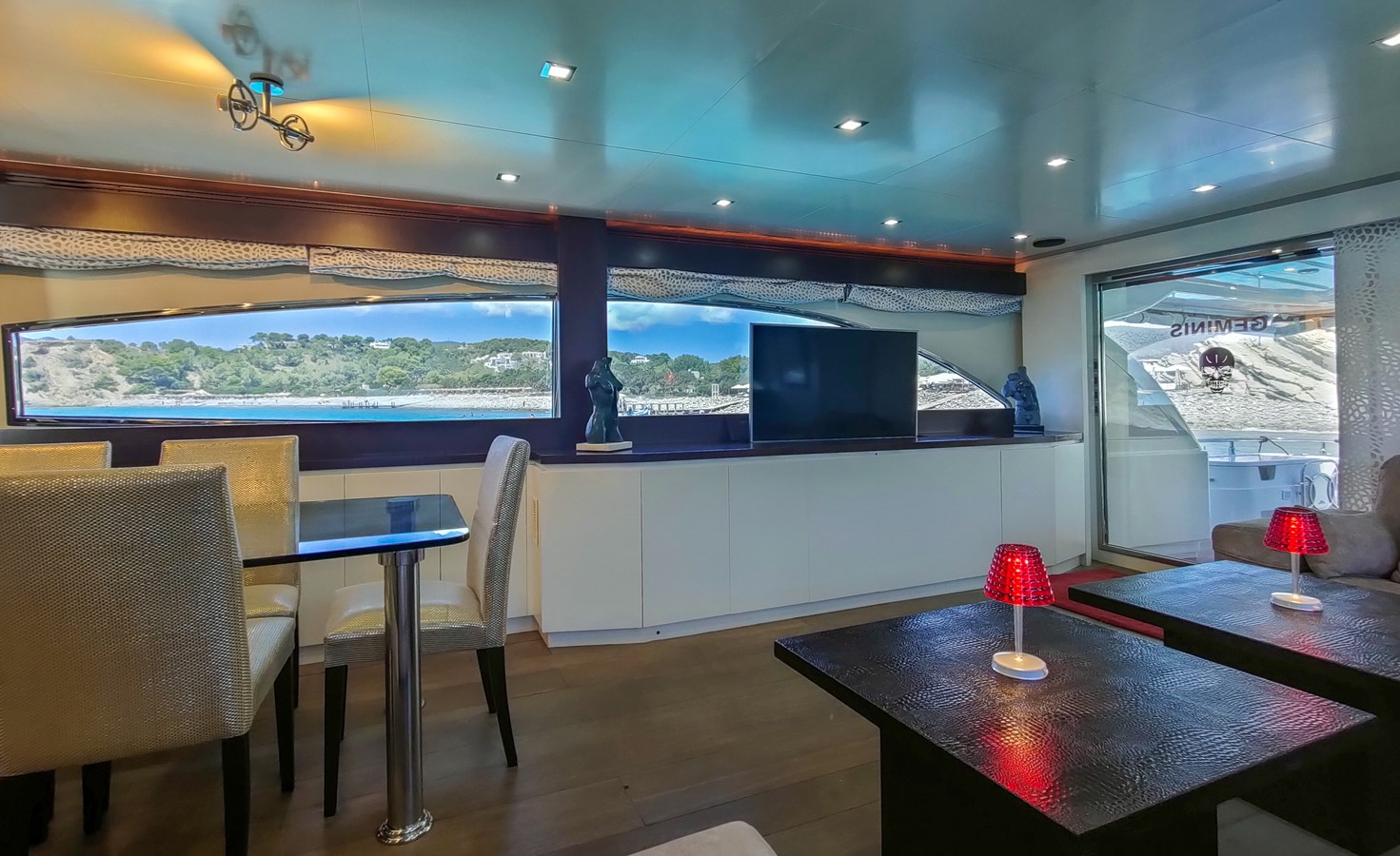 GEMINIS has plenty of exterior decks space to enjoy the warm Mediterranean climates. The aft deck is shaded and boasts an alfresco dining option and built in upholstered seating. Water enthusiasts will be able to make effortless use of the great selection of water toys (Jet Ski, SEABOB, Inflatables) from the extended swim platform. Charter yacht GEMINI is a sun worshipers paradise offering ample sunning. The foredeck has a double sunpad which is easily accessed from the wide side decks. Above, the flybridge offers plenty of further sunning on 2 sunpads, seating and deck space. Probably most importantly for many there is also a flybridge jacuzzi on the deck.