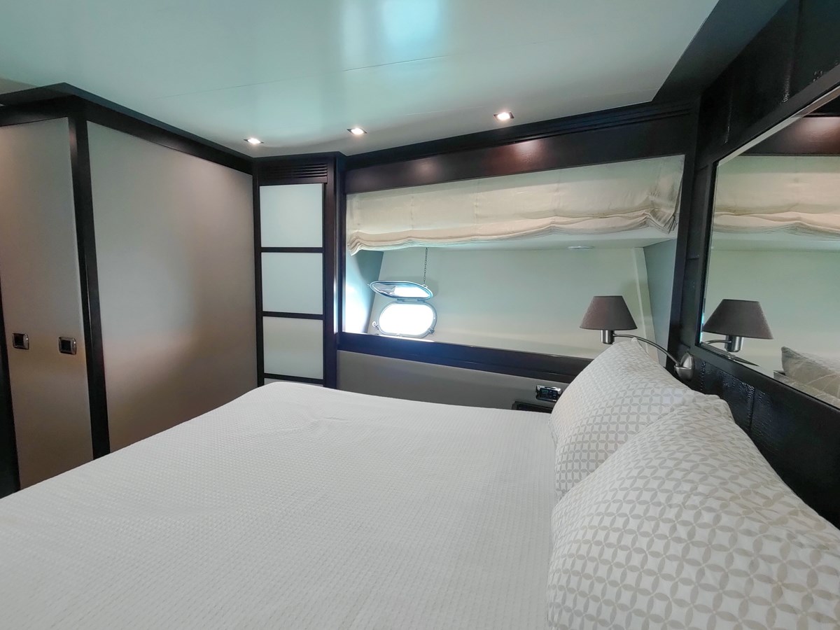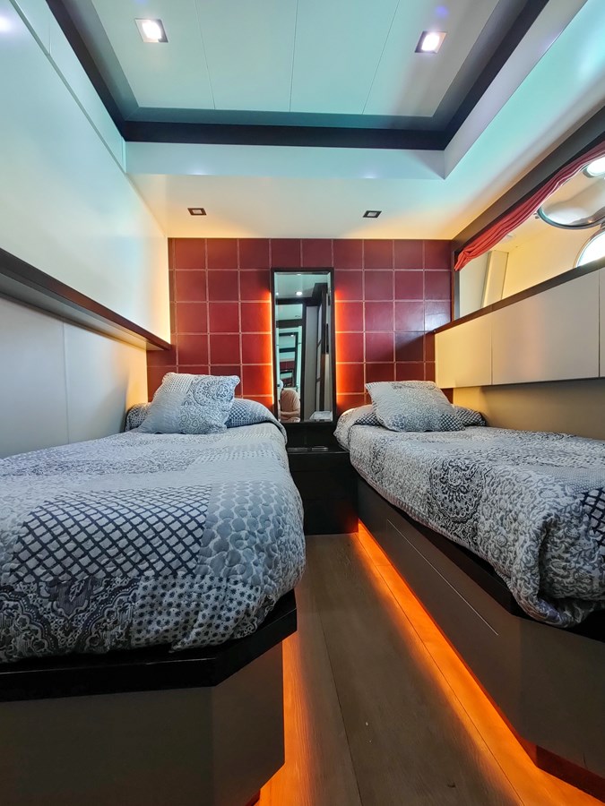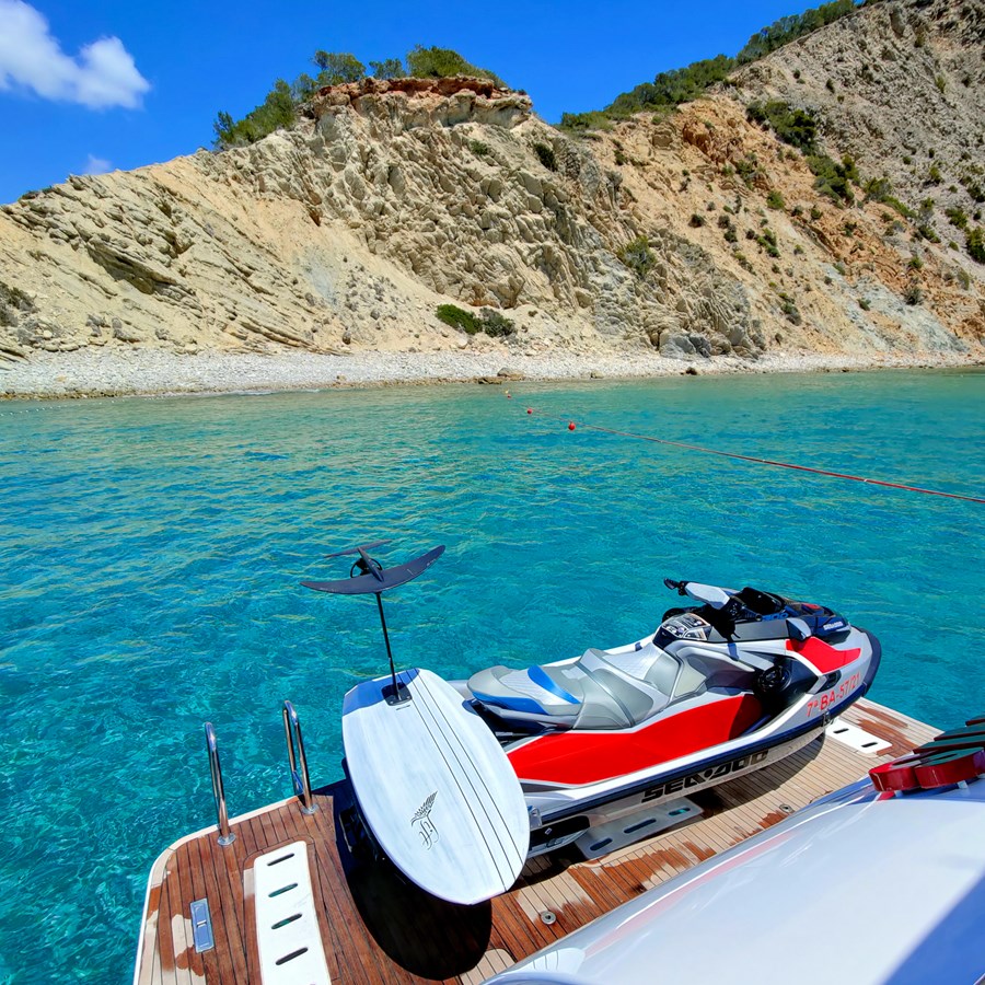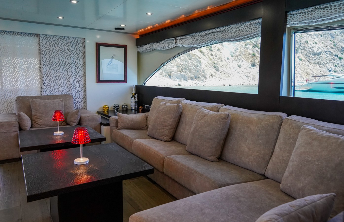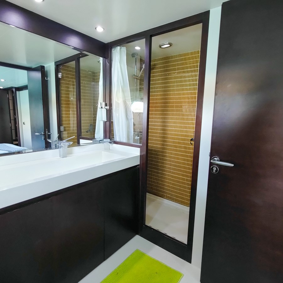 GEMINIS has plenty of exterior decks space to enjoy the warm Mediterranean climates. The aft deck is shaded and boasts an alfresco dining option and built in upholstered seating. Water enthusiasts will be able to make effortless use of the great selection of water toys (Jet Ski, SEABOB, Inflatables) from the extended swim platform. Charter yacht GEMINI is a sun worshipers paradise offering ample sunning. The foredeck has a double sunpad which is easily accessed from the wide side decks. Above, the flybridge offers plenty of further sunning on 2 sunpads, seating and deck space. Probably most importantly for many there is also a flybridge jacuzzi on the deck.