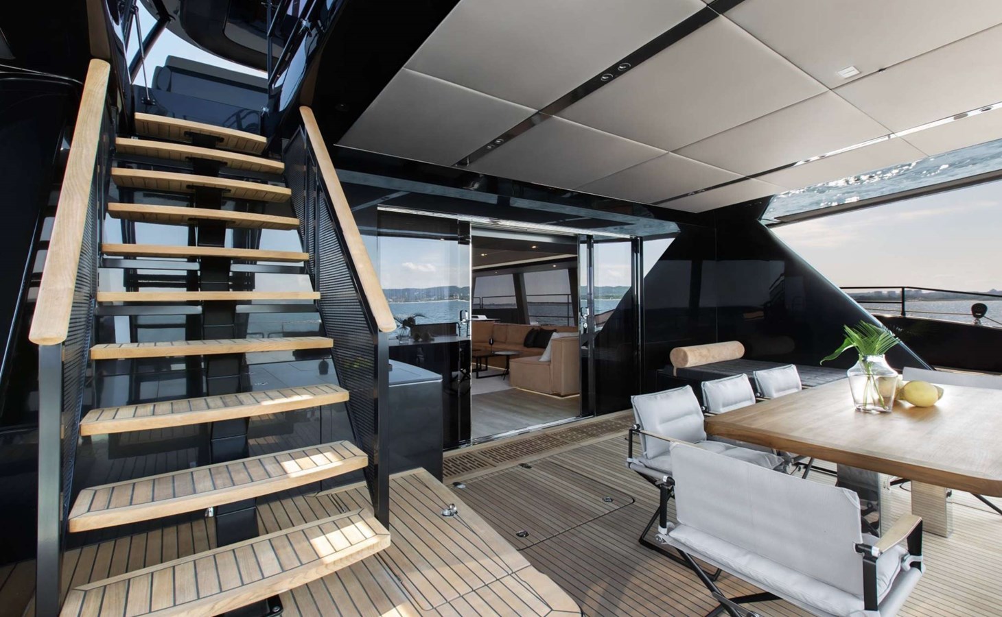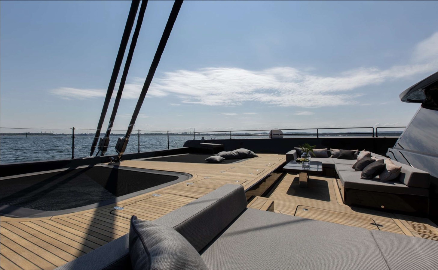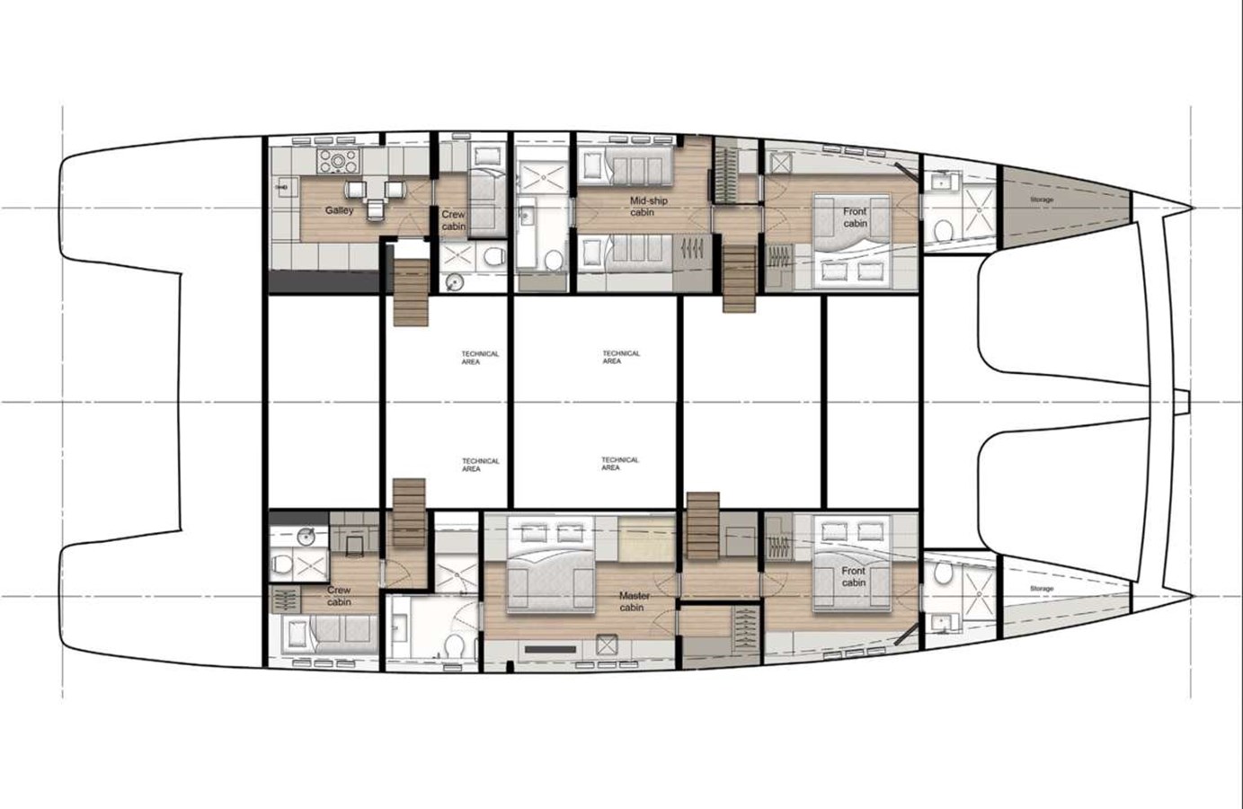 GRAYONE is a very fashionable dark grey hull color highlighting her gorgeous exterior lines and the enormous deck area covering the three teak decks. The formal dining area is located to port, while a luxurious sofa and matching drop-down table are located in the centre area, beneath the port windows. The opposite side features a comfy L-shaped sofa accompanied by coffee tables, armchairs, and footstools, all of which can be used as extra gathering and resting spaces. In contrast to the traditional nautical decor found on other luxury yachts of a comparable size, the interior of this one features a light ceiling and floors, dark blue and white tones, and a warm, welcome soft orange utilized in part for the materials.The GRAYONE luxury catamaran's clever internal layout allows for a front bar complete with a wine cellar to serve guests both inside the boat and on the foredeck. Guests will have a hard time deciding between the aft cockpit, the spacious flybridge, and the upper deck, which features two loungers, integrated seating with breathtaking views of the water, and a cocktail table.A wide electro-hydraulic bathing platform is essential for the luxury crewed catamaran GRAYONE to store the fast tender, which is powered by 110hp and can reach speeds of over 35 knots. Along with the floating deck, the water toys, which include a SeaDoo jet ski, water skis, and a 16-square-meter floating swimming pool, may be securely thrown into the water.