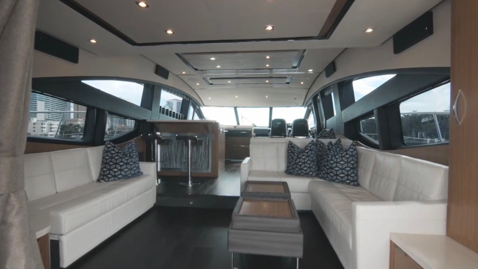 Inside, the yacht’s meticulously designed interior exudes luxury. The main salon offers a spacious, refined atmosphere with plush seating, elegant wood finishes, and tasteful décor. Large windows flood the space with natural light, creating an open, airy connection to the surroundings.