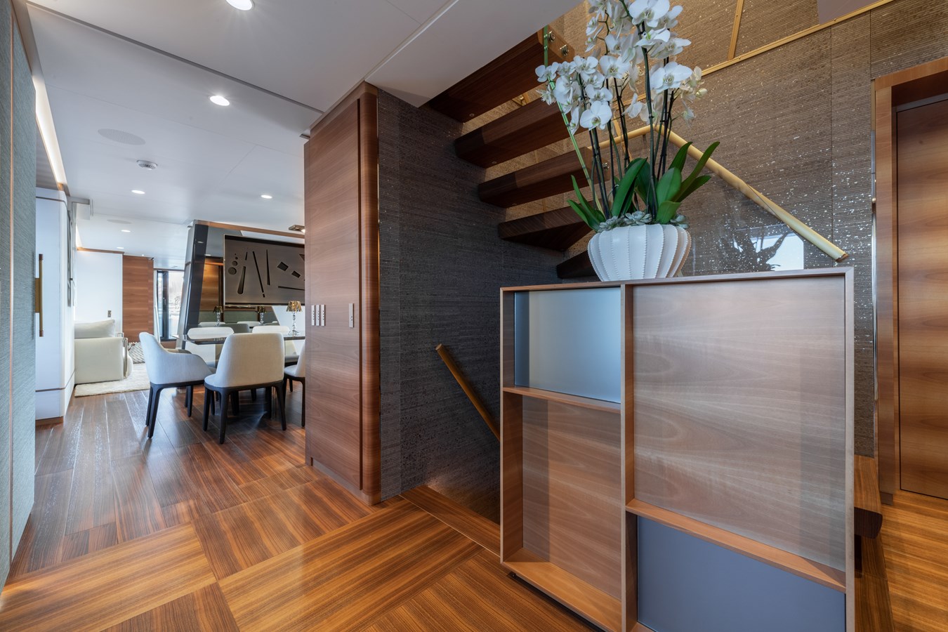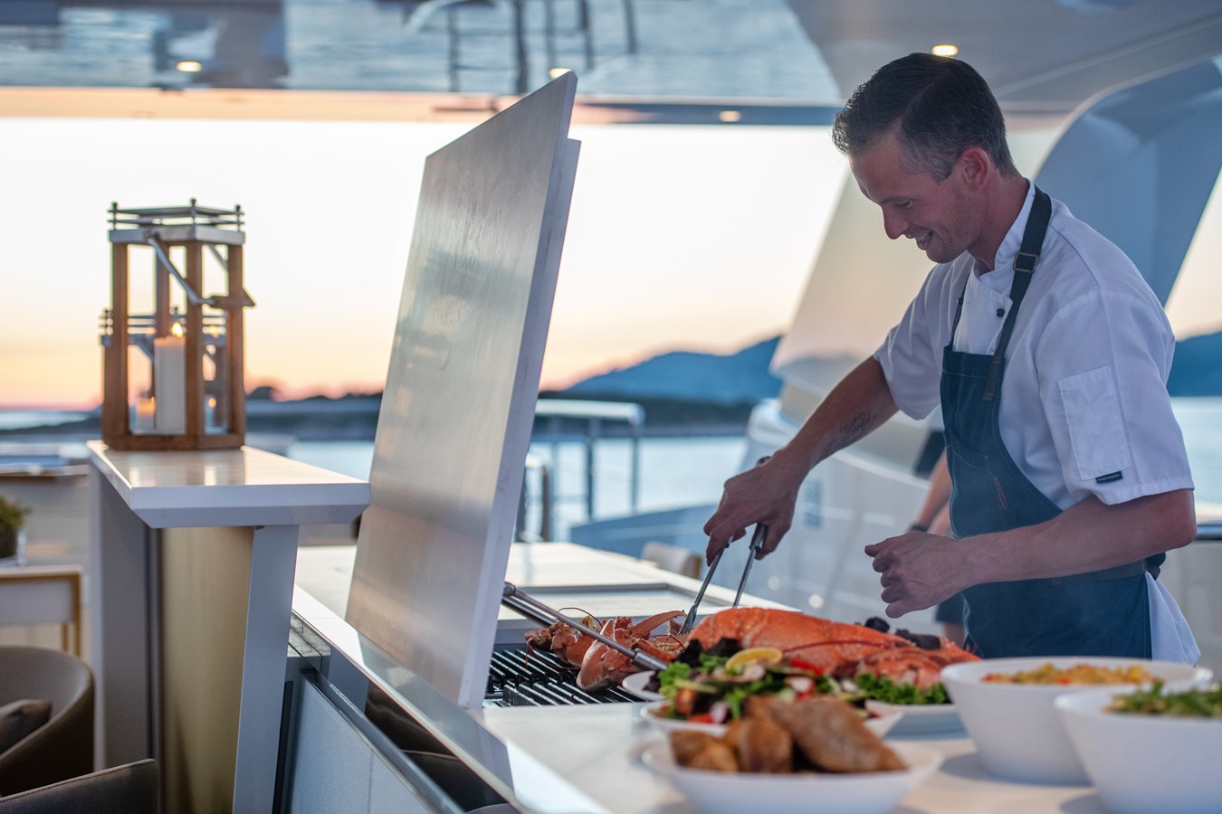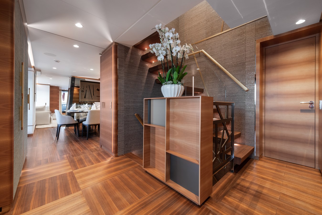 The exterior spaces are where MY MAYVA truly sets herself apart. Her expansive 140 sqm sun deck—the largest in her class—offers remarkable versatility. Modular furniture can be easily rearranged for sunrise yoga, social events, or even an open dance floor, while the infinity pool serves as a spectacular centerpiece.