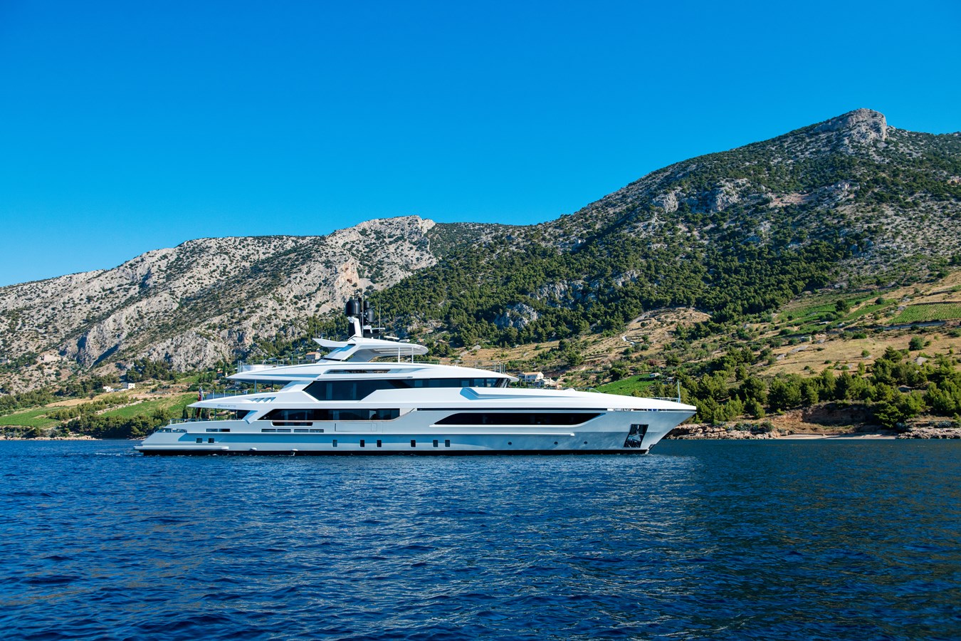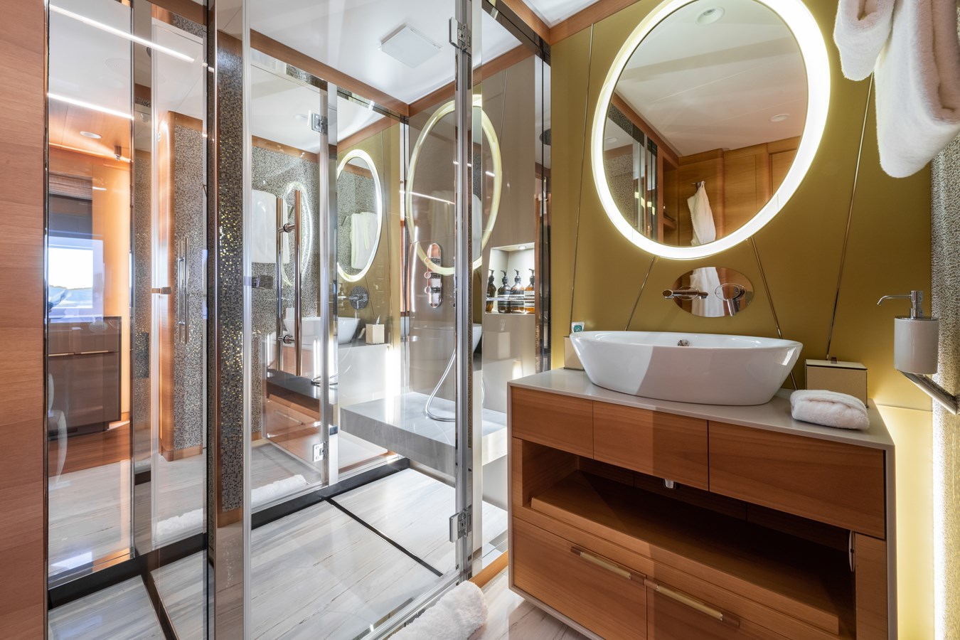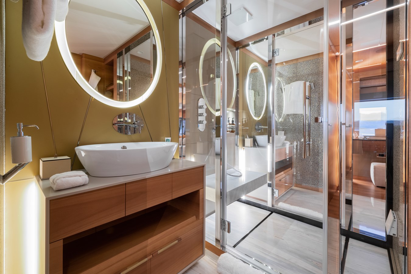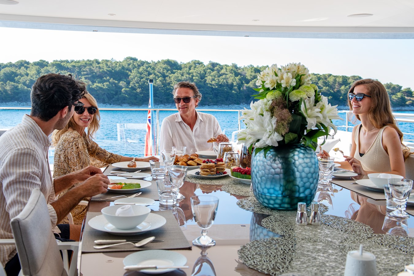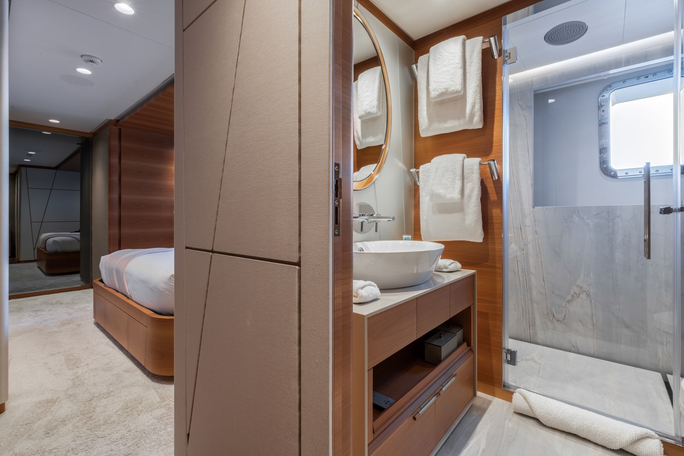 MY MAYVA accommodates 10–12 guests in a highly charter-friendly layout of five cabins. The main deck Master suite includes a private office, walk-in wardrobe, and his-and-her bathrooms. The lower deck hosts two double cabins and two convertible twin cabins, each with a Pullman bed, offering excellent flexibility for families or mixed groups.
