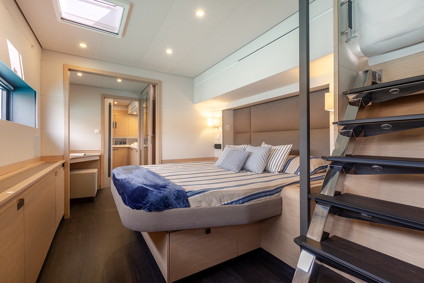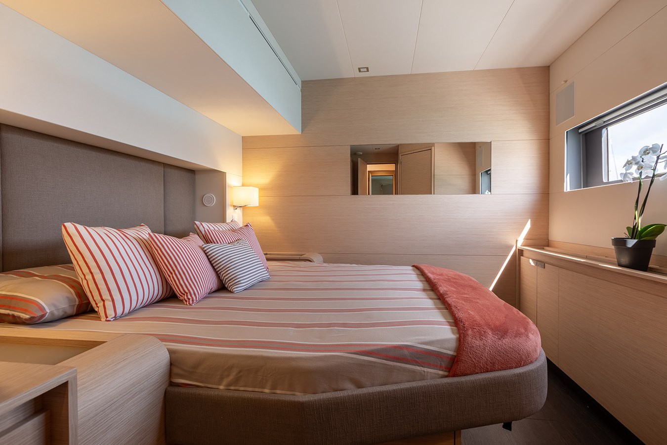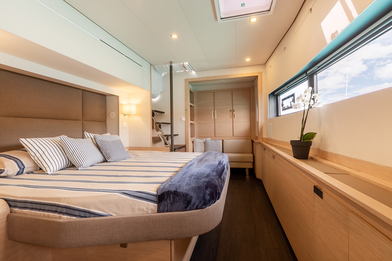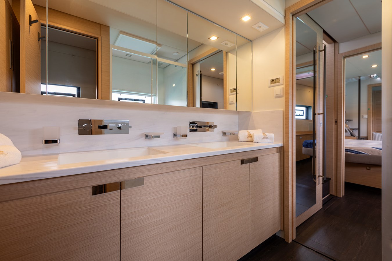 The owner’s suite aboard VAGATOR is a private retreat, located in the starboard hull. It features a king-size bed, a comfortable lounge area, a dressing room, and a spacious en-suite bathroom with double washbasins, all designed to evoke the atmosphere of a private seaside residence. Her layout accommodates four beautifully appointed cabins, each crafted to deliver privacy, comfort, and style.