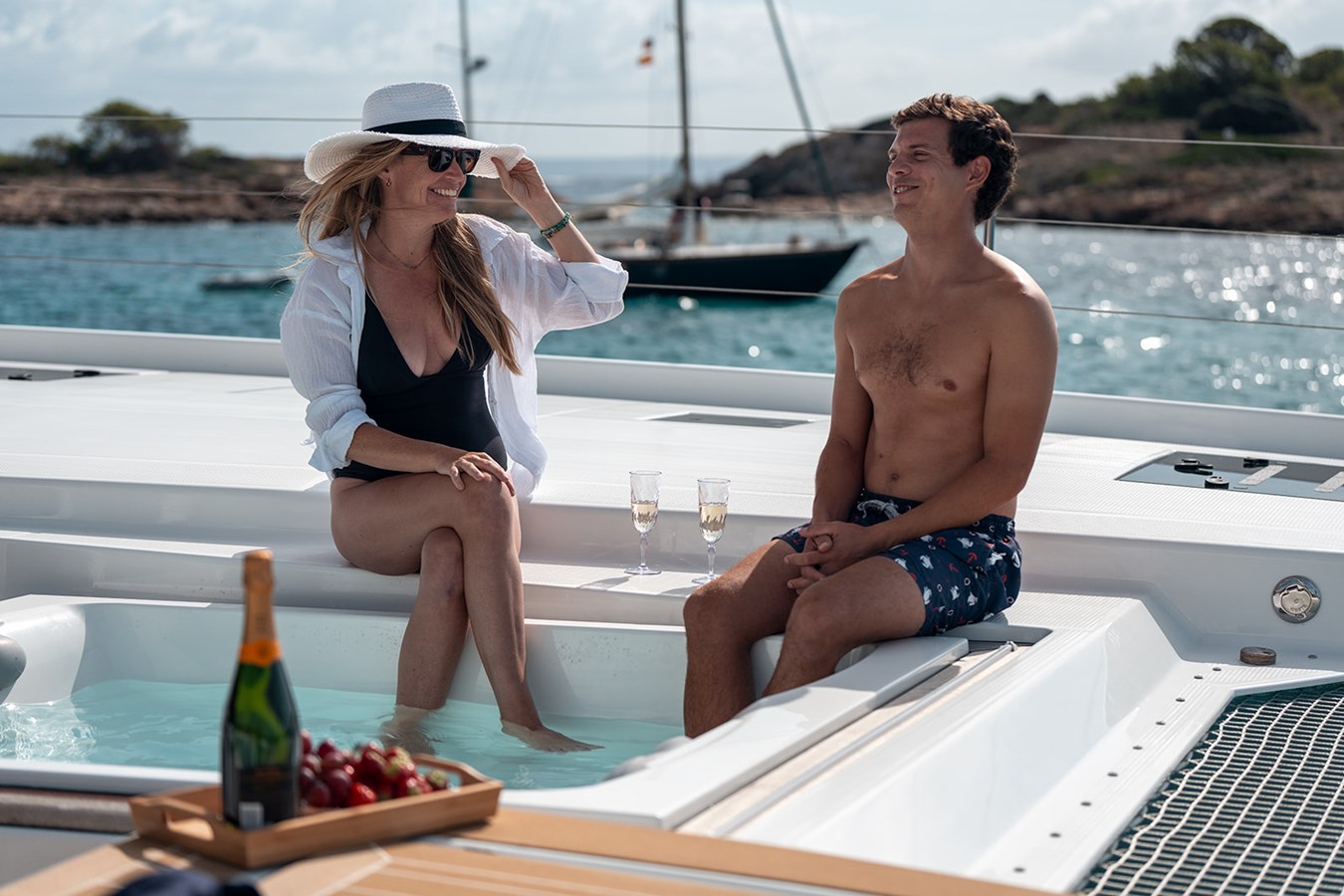 With her graceful lines, inverted bows, and expansive flybridge, VAGATOR commands attention wherever she sails. Large panoramic windows flood the interior with natural light and offer breathtaking views of the sea. A standout feature is the forward cockpit — accessible directly from the owner’s suite — featuring a jacuzzi, creating an unparalleled space for relaxation and enjoyment at sea.